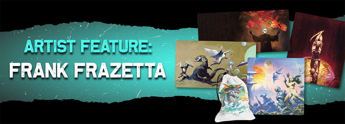 After achieving great success and notoriety for his comic book art, Frank’s world and work began to expand to other industries. In addition to comics and paperbacks, Frank’s designs have also appeared on LP Record Albums and even movie posters. Now, we can add playmats, mousepads, dice bags, and more to that list. We think that would’ve made Frank proud!