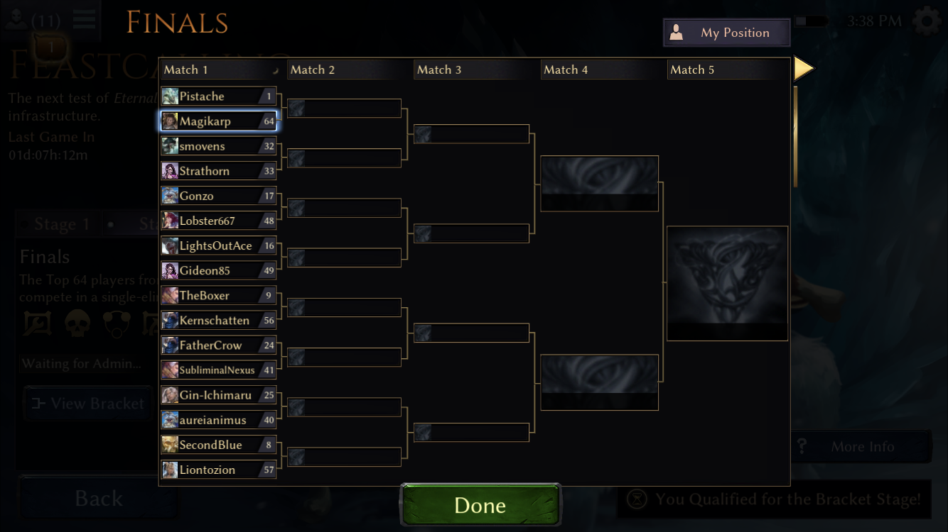 -Once the in-game timer expires, all top 64 players are sent a notification that they have qualified for the second stage of play and are placed into a 64-person bracket, 1st playing 64th, 2nd playing 63rd, and so on.