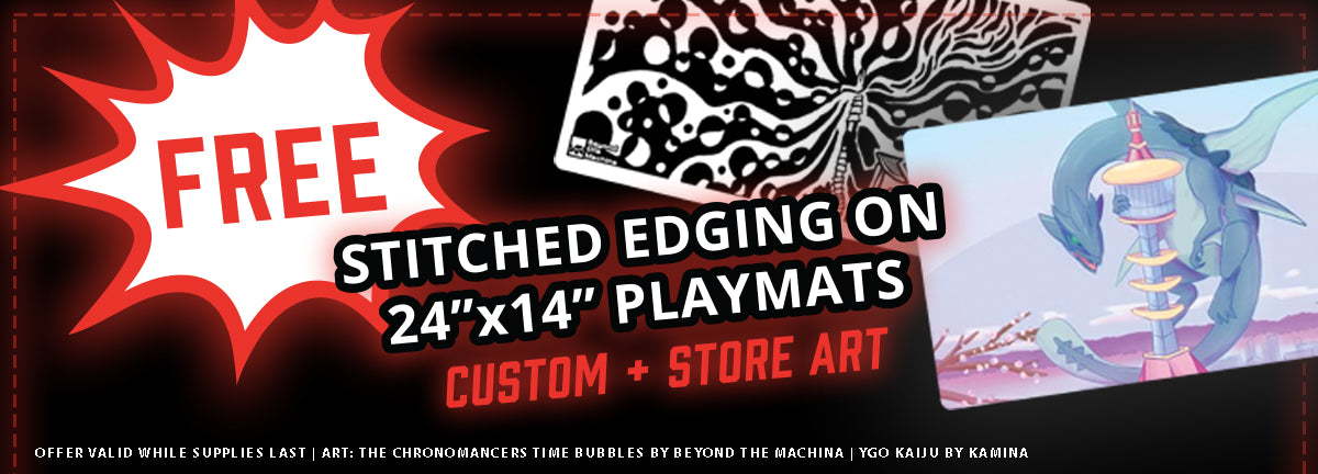 For a limited time, we're offering free stitched edging on our standard 24" x 14" playmats! All custom and store art 24" x 14" playmats with the stitched edging upgrade option on their product listing are eligible for this sale. Stitched edging is not a standalone product and cannot be added to products that do not offer the stitched edging upgrade option on the product listing.