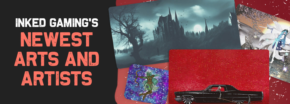 When fresh designs and new designers come through, we can’t wait to share them with you! This week, we’re highlighting a nice handful of new art along with a couple of new artists who just recently brought their work to our world. These latest designs have been printed on our premium goods (playmats, mousepads, dice bags, etc.), which means you can add them to your collection today and have them by your side during your next battle.