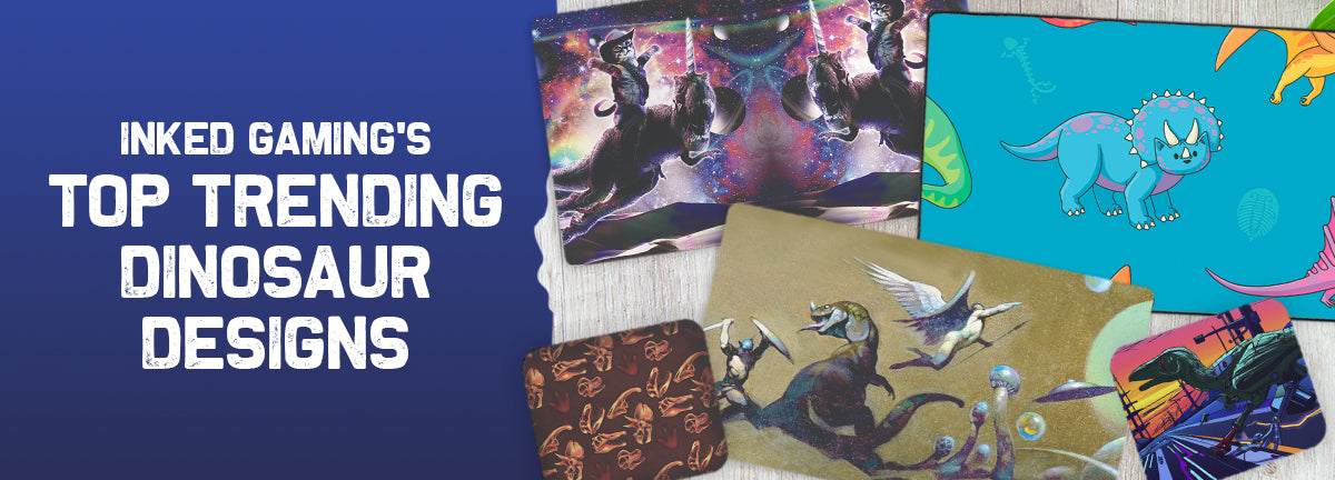 These dino-mite designs come from some of the most gifted artists in the world, including one legendary designer who is still considered the Godfather of Fantasy art. Each design is currently printed on a variety of our premium goods, and we’re glad to see that they are trending among our customers. So, if you’re looking for a cool new playmat, mousepad, dice bag, or even spacebar keycap to add to your collection, you may just find it on this list!