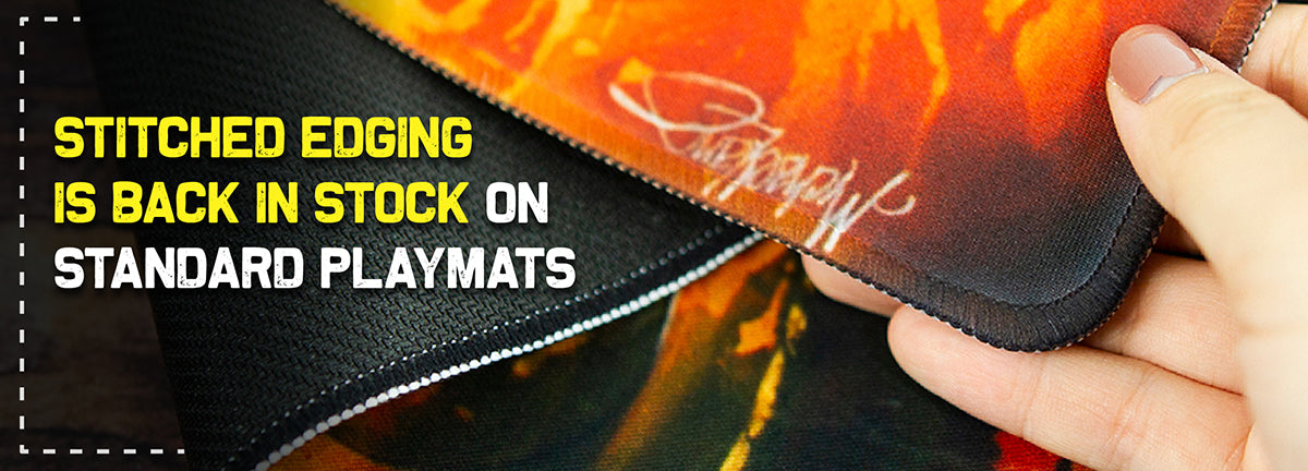 Yes, stitched edging is once again available for our standard playmats, which is good news for us…and even better for you. Why? Well, having the option to make your mat even more durable and less susceptible to fray and other forms of wear and tear is something all tabletop gamers should take advantage of. Mind you, our playmats are pretty solid and sturdy just the way they are, but if you really want it to last, having stitched edging around the corners can be invaluable to its longevity. We know from personal experience.
