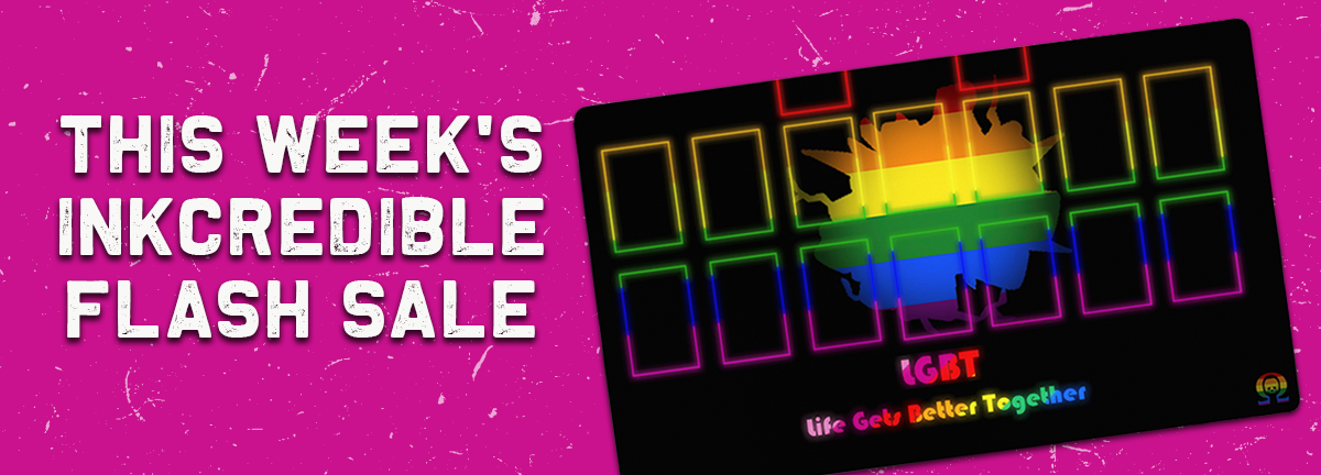 This Life Gets Better playmat is one of the items currently listed in our Pride collection, which means that by taking advantage of this sale, you’ll be helping us to contribute to Outside In’s mission. Once again, all you have to do is add the playmat to your cart and use the code: INKCREDIBLE at checkout. From there, the 25% discount will auto-apply to the mat.