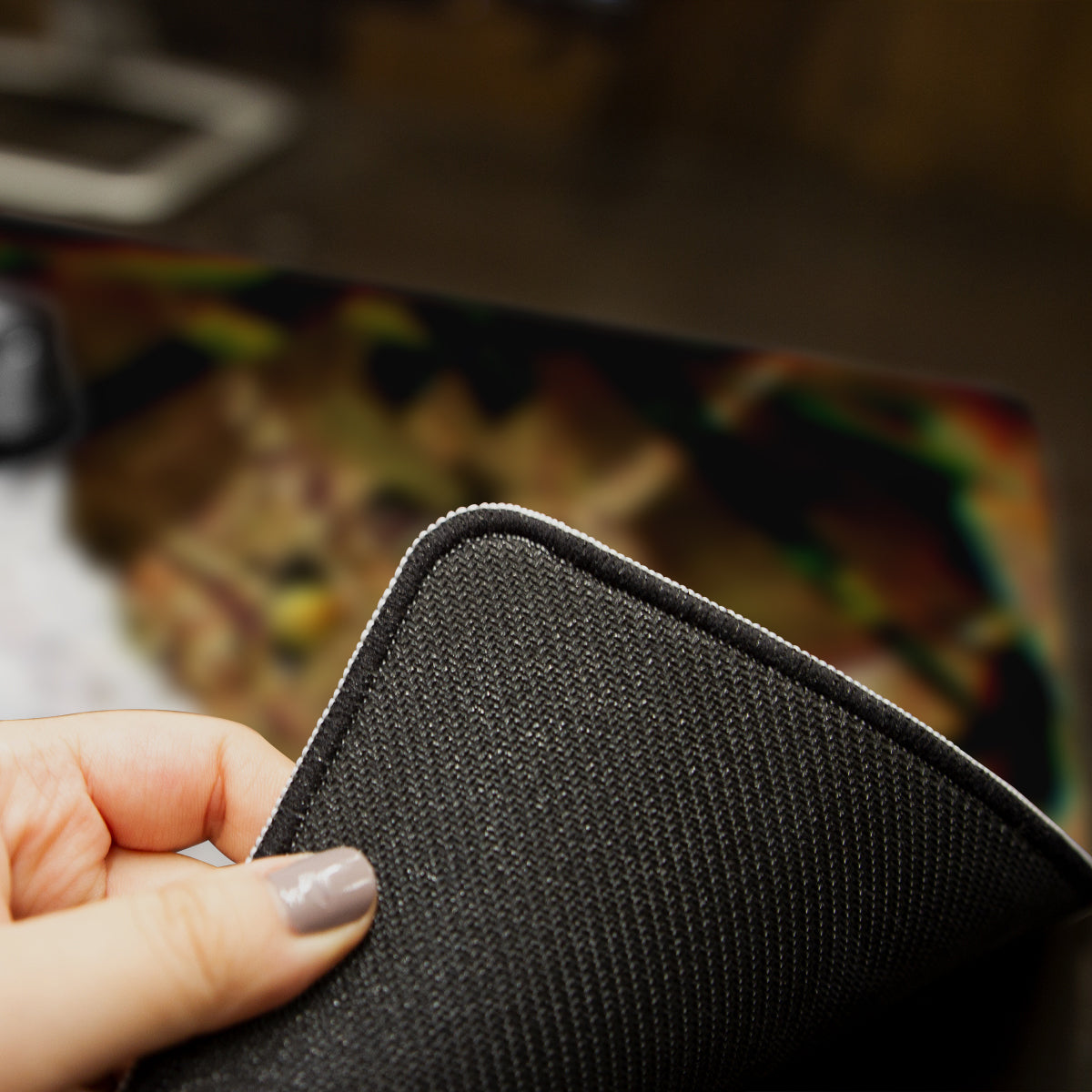 Need a new mousepad that features quality craftsmanship and creativity? Then you’ve definitely come to the right place. Our mousepads are made in-house with premium materials and unique artwork that give your battlestation the supreme look and feel that it deserves. The top is made from sleek polyester, which enables faster, more precise mouse movements. This enhanced speed and precision come in handy whether you’re working or gaming. On the bottom, there’s a strong anti-slip rubber backing that holds a nice, tight grip on your desk while you’re doing your thing. The action and traction this pad provides give you a better overall experience in completing daily tasks, deadlines, and missions of all kinds. And because we’ve added more sizing options to it, you no longer have to worry about running out of room at the worst moments either. The sizes are Classic, Large, and XL. The Classic mousepad has unstitched edges. However, the Large mousepad does include stitched edging, while the XL mousepad has both a stitched or unstitched edging option available. You can see the approximate measurements of all those sizes in the details below. We think you’ll be impressed…if you aren’t already!