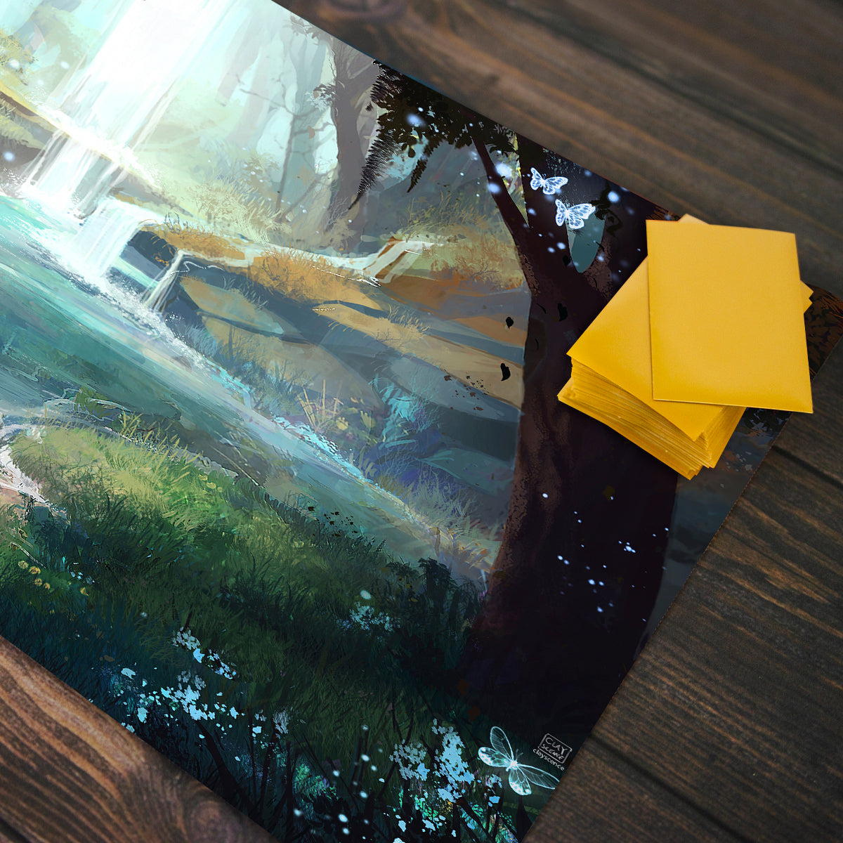 If you’re looking to make your battlefield a more peaceful place to play, Clayscence’s Glimmer Forest playmat may be the serene scene you’re looking for! Just like everything playmat that Inked Gaming produces, this one features premium materials and quality craftsmanship to go along with the awesome art from Clayscence. The top has been fitted with a smooth, soft cloth that lets you move and manage your cards with ease. That means no more sliding your cards to the edge or struggling to pick them up at the most pivotal points of the battle. We’ve also added a strong anti-slip rubber backing on that bottom that keeps a tight grip on every surface. Whether you’re a Pokémon trainer, Yu-Gi-Oh! duelist, or MTG wizard, this playmat is designed to give you the best card gaming experience possible!