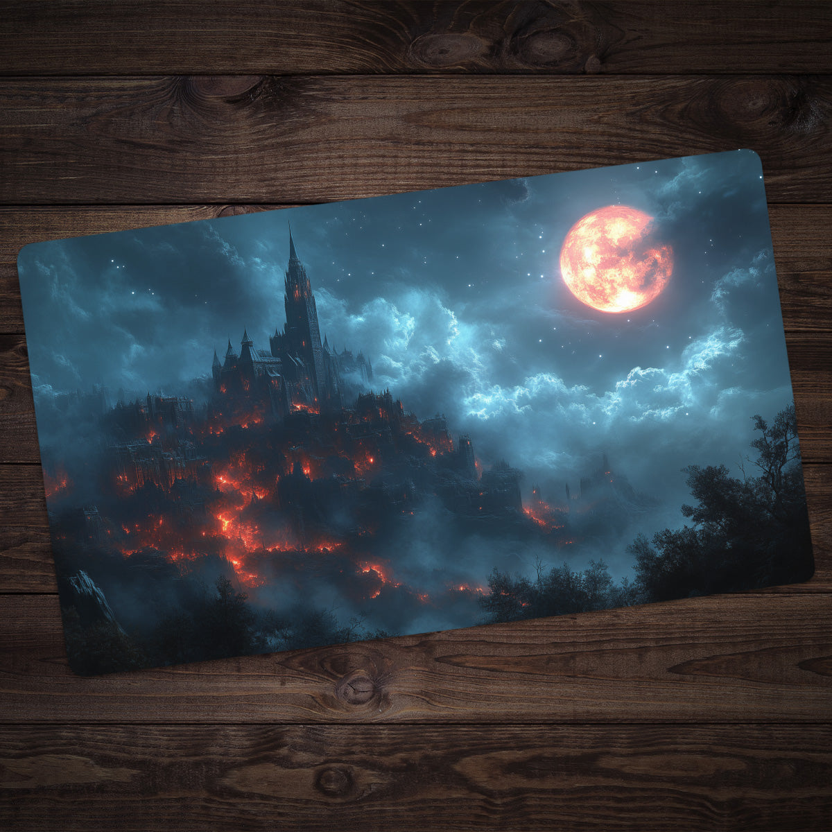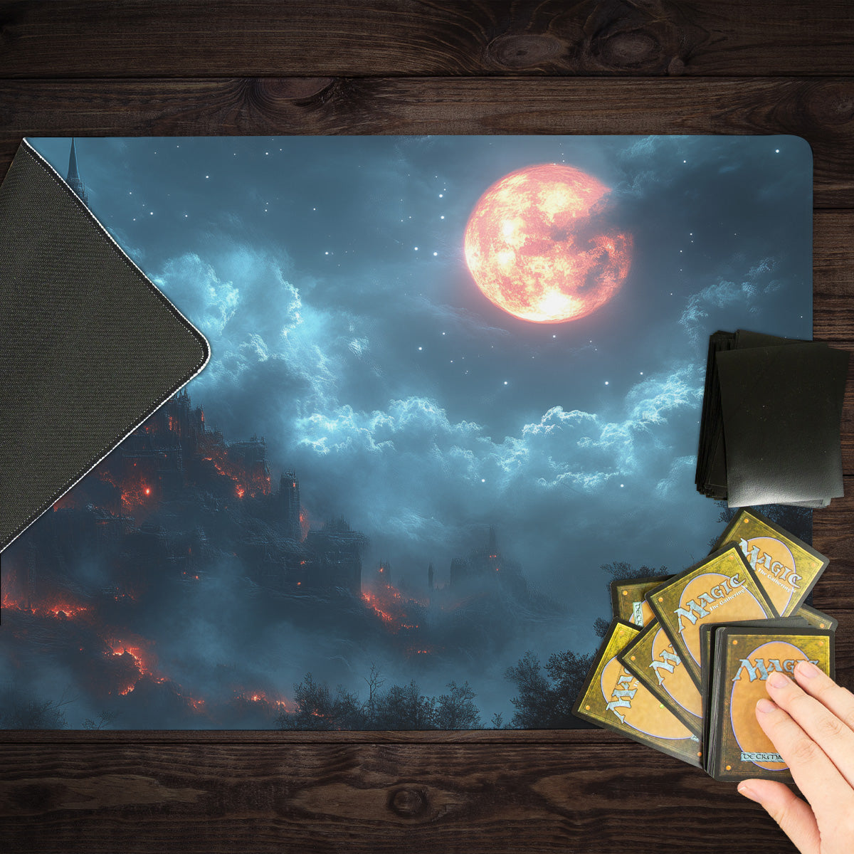 Oversized Playmat measures at 28” x 14” inches and is 1/16 of an inch thick. It’s made with a smooth cloth top and strong rubber backing.