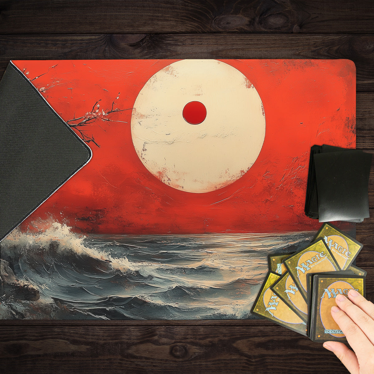 Oversized Playmat measures at 28” x 14” inches and is 1/16 of an inch thick. It’s made with a smooth cloth top and strong rubber backing.