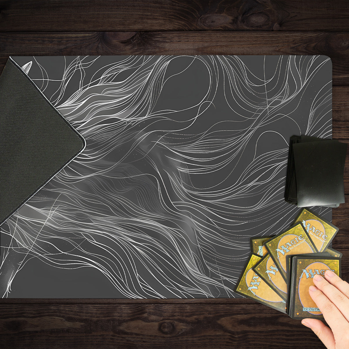 Standard Playmat measures at 24” x 14” inches and is 1/16 of an inch thick. It’s made with a smooth cloth top and strong rubber backing.