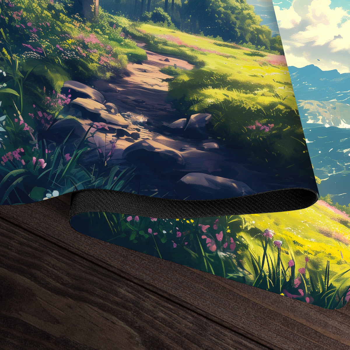 Oversized Playmat measures at 28” x 14” inches and is 1/16 of an inch thick. It’s made with a smooth cloth top and strong rubber backing.