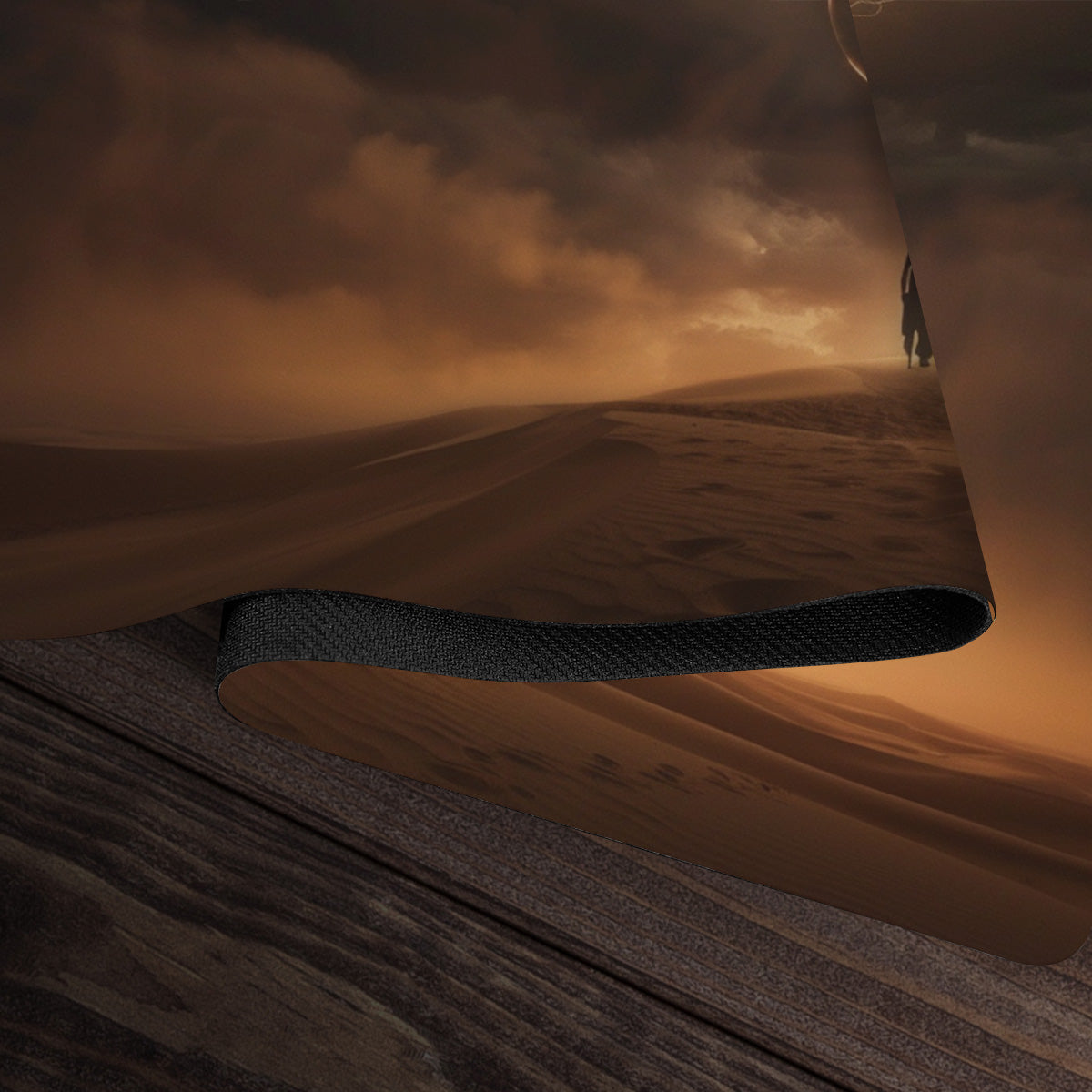 Standard Playmat measures at 24” x 14” inches and is 1/16 of an inch thick. It’s made with a smooth cloth top and strong rubber backing.