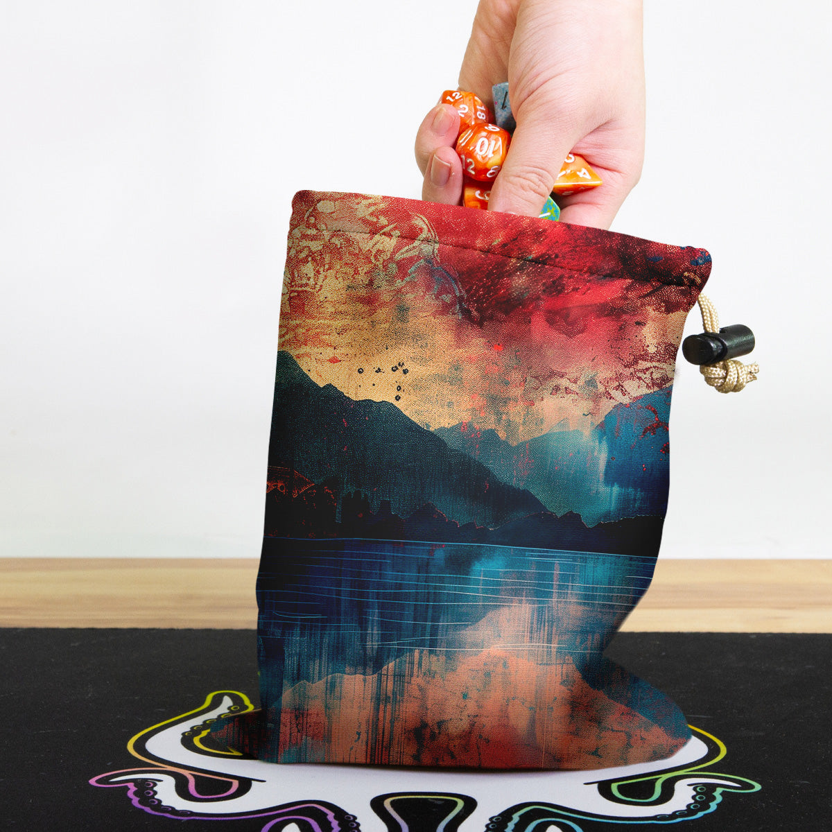 Always gaming on the go? Carry everything you need and more using our specially crafted dice bag. But this bag is designed to hold more than just dice. We make it so you can carry other essential accessories and gear with your dice, including deck boxes, life counters, extra sleeves, and pens. Quality is just as important as quantity, which is why our dice bags are crafted using premium material as well. Featuring a soft inner lining and microfiber on the inside and vibrant pre-designed artwork on the outside, our dice bag has an amazing look and feel to it!