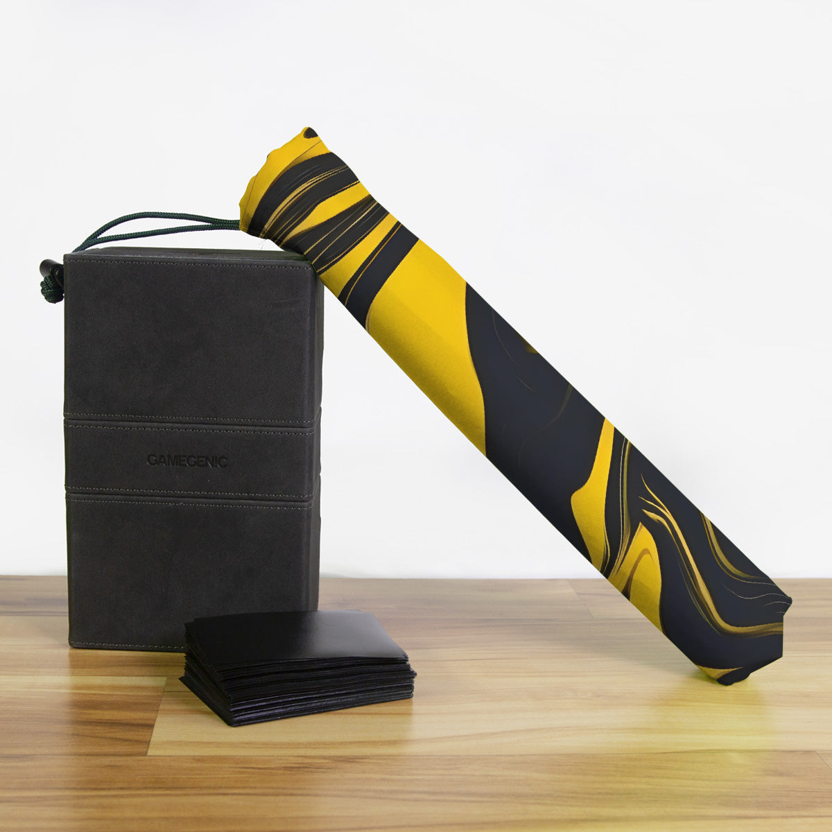 Keep your playmat in pristine condition wherever you go with one of our handcrafted playmat bags. This playmat bag is specifically designed to protect your playmat and can hold two standard sized mats at the same time (in case you need a backup or your friend forgets theirs). Each bag is made in-house and features a water-resistant coating along with a drawstring and carabiner clip for secure carrying. So you can take your game anywhere and in any weather.