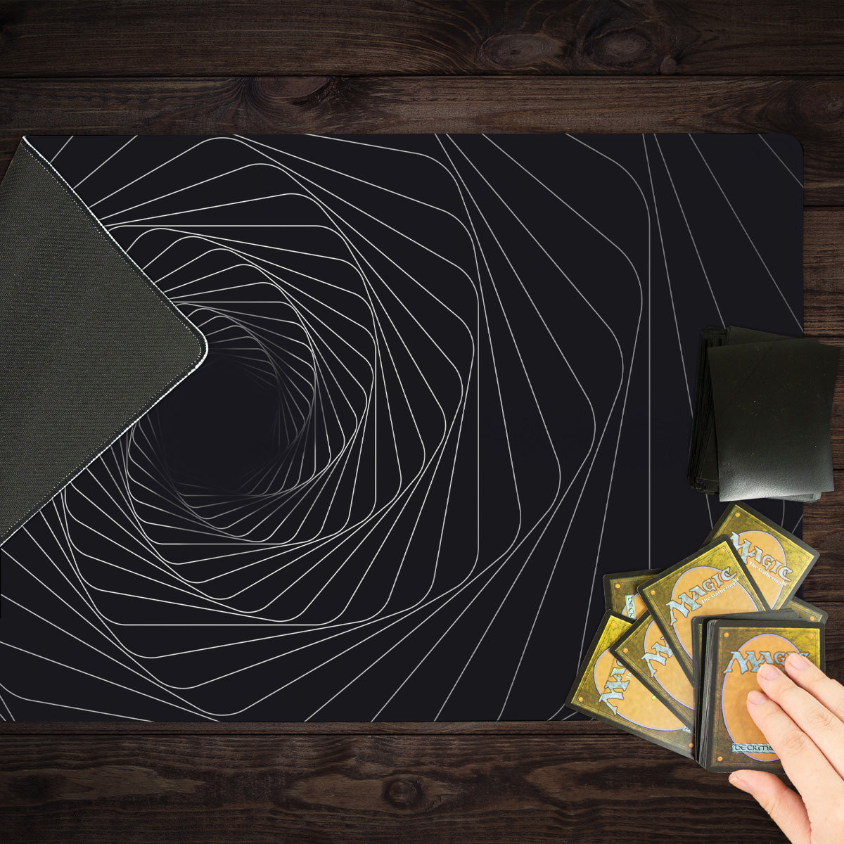 Standard Playmat measures at 24” x 14” inches and is 1/16 of an inch thick. It’s made with a smooth cloth top and strong rubber backing.