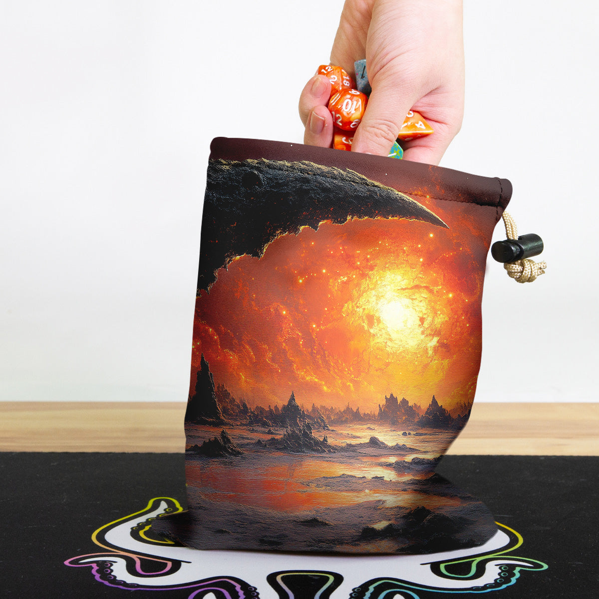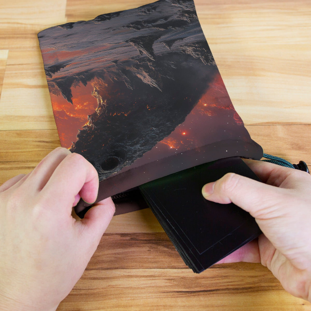 Always gaming on the go? Carry everything you need and more using our specially crafted dice bag. But this bag is designed to hold more than just dice. We make it so you can carry other essential accessories and gear with your dice, including deck boxes, life counters, extra sleeves, and pens. Quality is just as important as quantity, which is why our dice bags are crafted using premium material as well. Featuring a soft inner lining and microfiber on the inside and vibrant pre-designed artwork on the outside, our dice bag has an amazing look and feel to it!