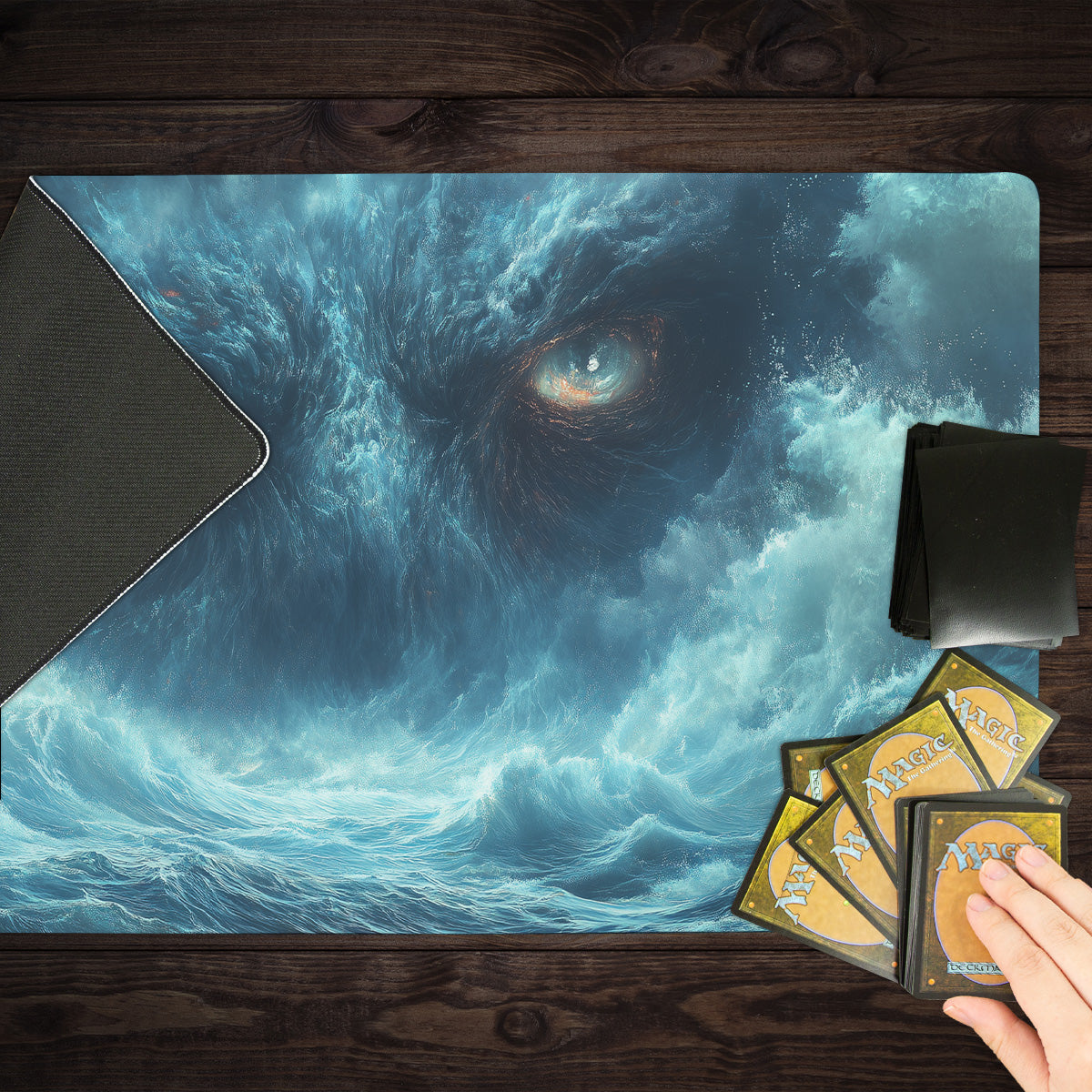 Oversized Playmat measures at 28” x 14” inches and is 1/16 of an inch thick. It’s made with a smooth cloth top and strong rubber backing.