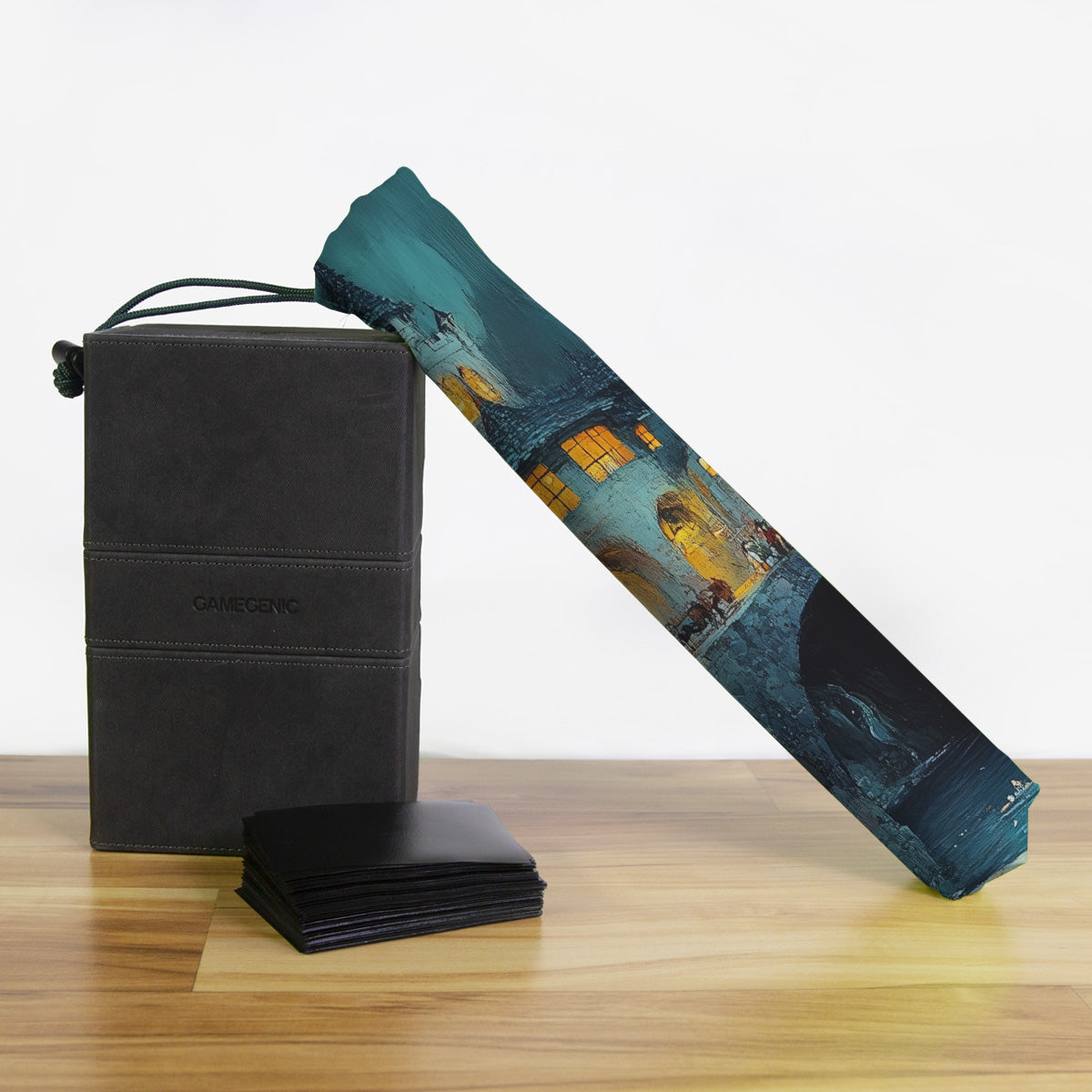 Keep your playmat in pristine condition wherever you go with one of our handcrafted playmat bags. This playmat bag is specifically designed to protect your playmat and can hold two standard sized mats at the same time (in case you need a backup or your friend forgets theirs). Each bag is made in-house and features a water-resistant coating along with a drawstring and carabiner clip for secure carrying. So you can take your game anywhere and in any weather.