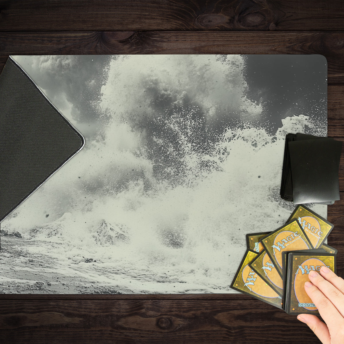 Oversized Playmat measures at 28” x 14” inches and is 1/16 of an inch thick. It’s made with a smooth cloth top and strong rubber backing.