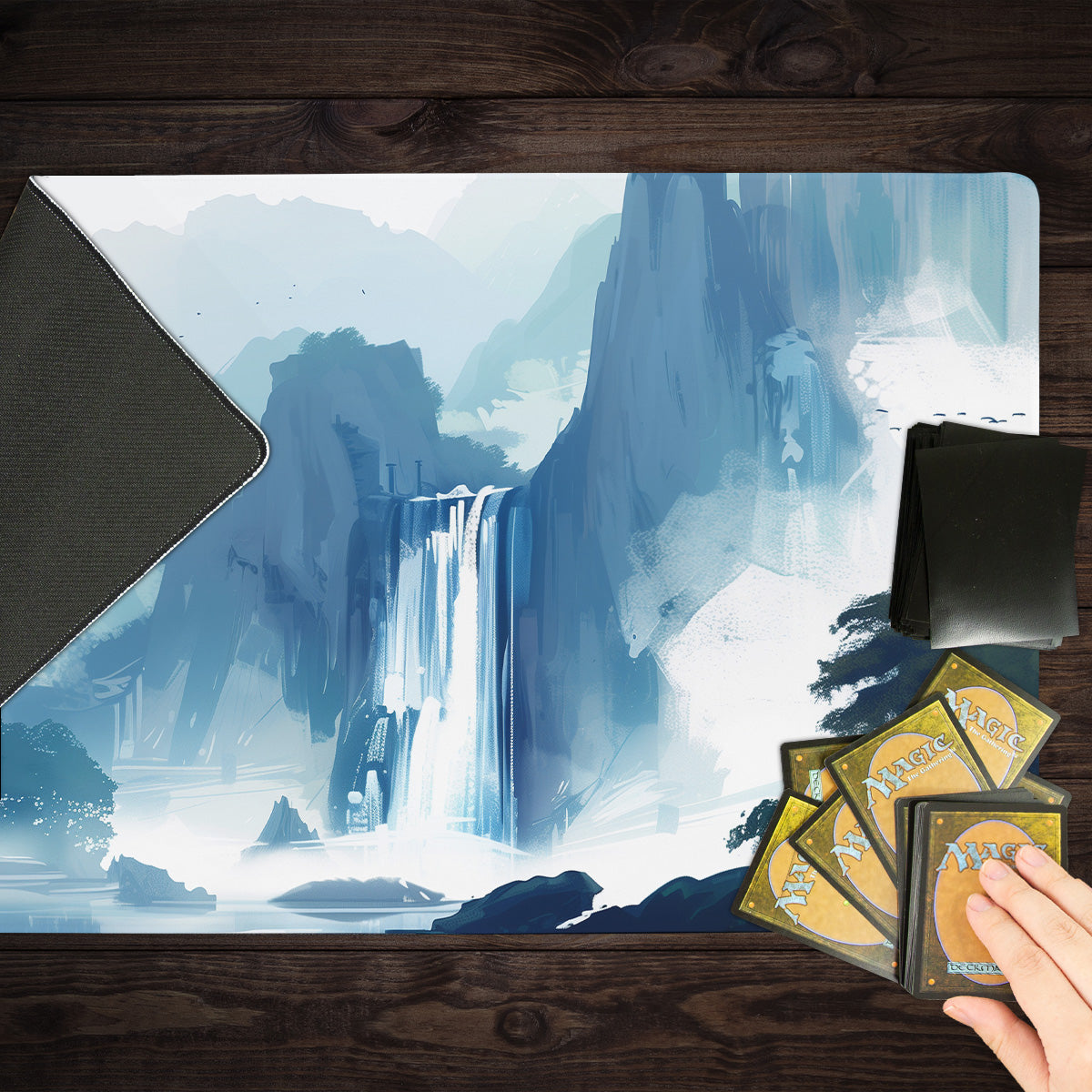 Standard Playmat measures at 24” x 14” inches and is 1/16 of an inch thick. It’s made with a smooth cloth top and strong rubber backing.