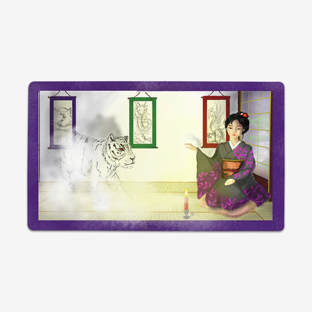 I’m a cat person, so drawing cats is always my favorite. I’m have also been a MTG player just for one and a half years. Recently I got my first Wacom drawing tablet and started working on drawing play mats. For me, I wanted to create play mats with stories in them. Thinking about the story behind my design is the part that I enjoy the most!