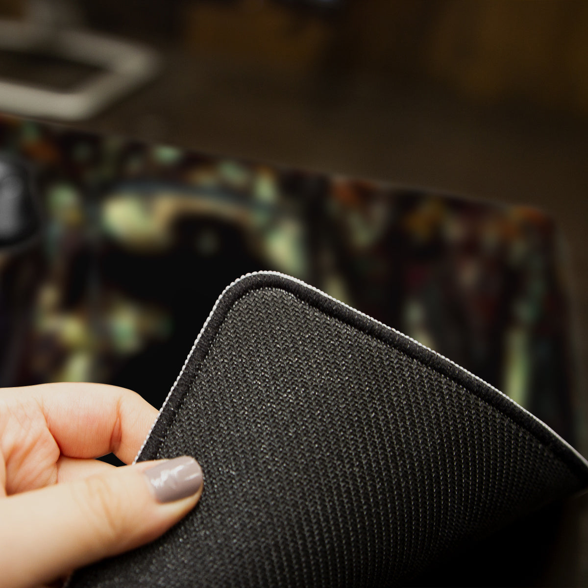 Need a new mousepad that features quality craftsmanship and creativity? Then you’ve definitely come to the right place. Our mousepads are made in-house with premium materials and unique artwork that give your battlestation the supreme look and feel that it deserves. The top is made from sleek polyester, which enables faster, more precise mouse movements. This enhanced speed and precision come in handy whether you’re working or gaming. On the bottom, there’s a strong anti-slip rubber backing that holds a nice, tight grip on your desk while you’re doing your thing. The action and traction this pad provides give you a better overall experience in completing daily tasks, deadlines, and missions of all kinds. And because we’ve added more sizing options to it, you no longer have to worry about running out of room at the worst moments either. The sizes are Classic, Large, and XL. The Classic mousepad has unstitched edges. However, the Large mousepad does include stitched edging, while the XL mousepad has both a stitched or unstitched edging option available. You can see the approximate measurements of all those sizes in the details below. We think you’ll be impressed…if you aren’t already!