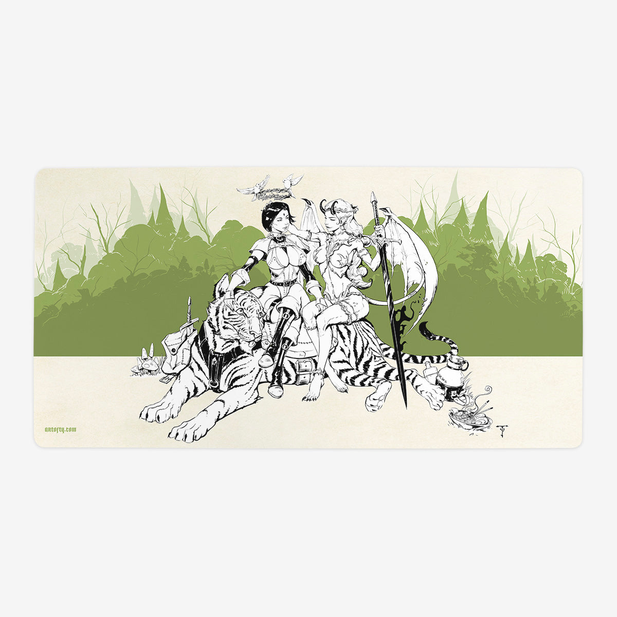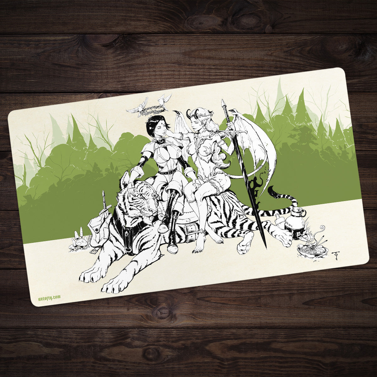 Oversized Playmat measures at 28” x 14” inches and is 1/16 of an inch thick. It’s made with a smooth cloth top and strong rubber backing.