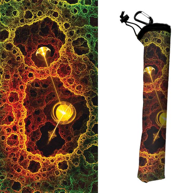 Playmat Bags are specifically designed to hold your mats in style. They are large enough to carry up to two mats. They are coated to be water resistant and include a strap with carabiner for carrying on your backpack. Our bags are hand made in house, and to order. A design that is vertical or patterned would be best for this type of product.