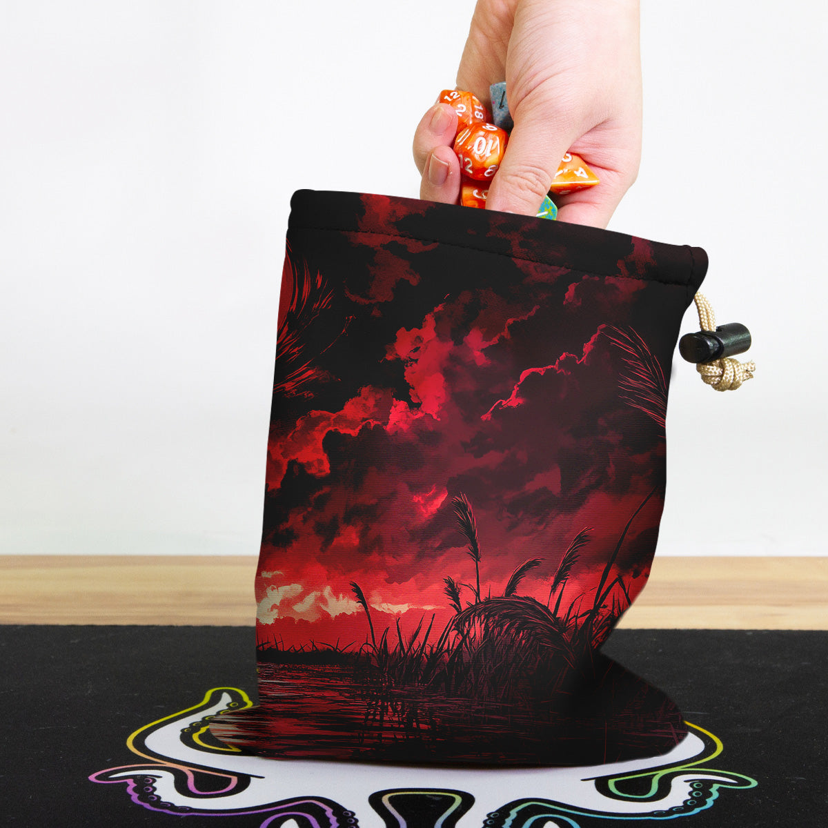 Always gaming on the go? Carry everything you need and more using our specially crafted dice bag. But this bag is designed to hold more than just dice. We make it so you can carry other essential accessories and gear with your dice, including deck boxes, life counters, extra sleeves, and pens. Quality is just as important as quantity, which is why our dice bags are crafted using premium material as well. Featuring a soft inner lining and microfiber on the inside and vibrant pre-designed artwork on the outside, our dice bag has an amazing look and feel to it!