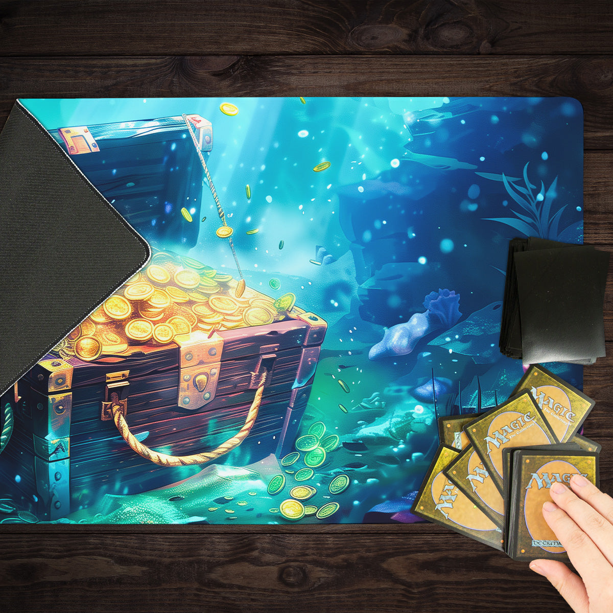 Oversized Playmat measures at 28” x 14” inches and is 1/16 of an inch thick. It’s made with a smooth cloth top and strong rubber backing.