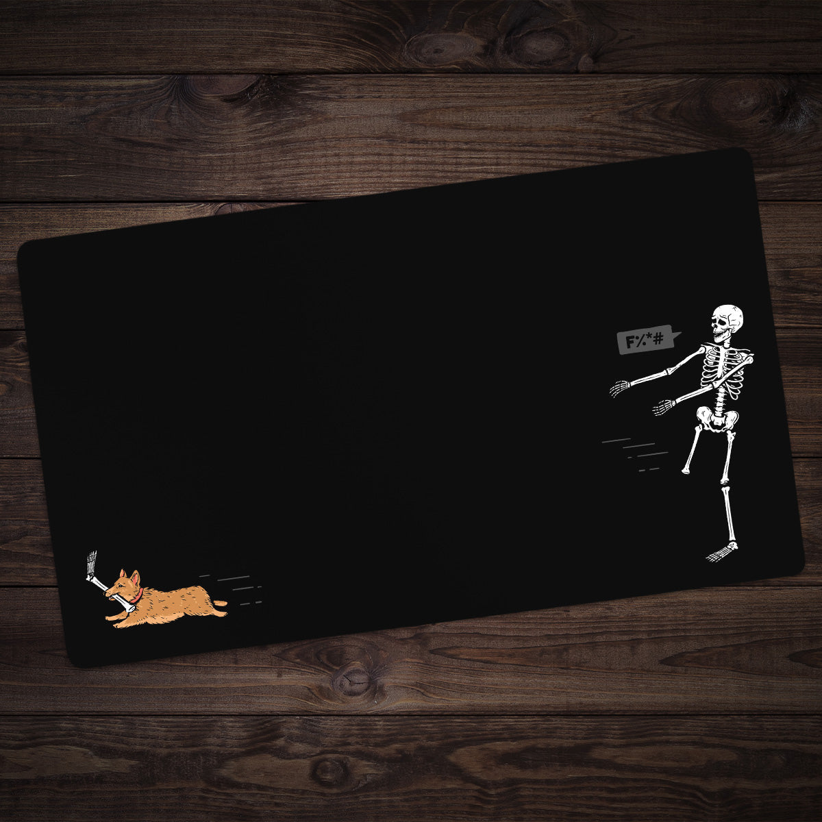 Oversized Playmat measures at 28” x 14” inches and is 1/16 of an inch thick. It’s made with a smooth cloth top and strong rubber backing.