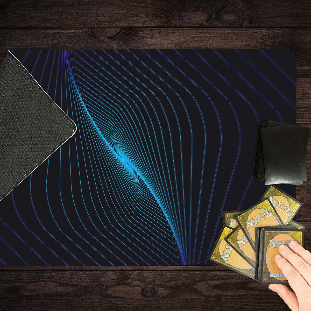 Standard Playmat measures at 24” x 14” inches and is 1/16 of an inch thick. It’s made with a smooth cloth top and strong rubber backing.