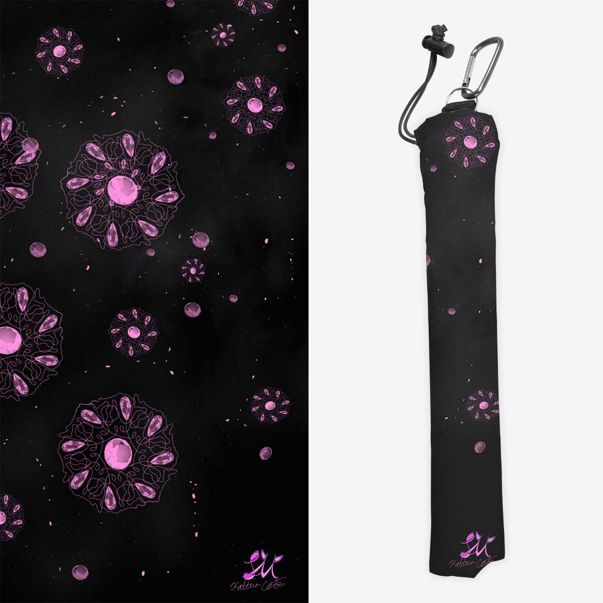 Playmat Bags are specifically designed to hold your mats in style. They are large enough to carry up to two mats. They are coated to be water resistant and include a strap with carabiner for carrying on your backpack. Our bags are hand made in house, and to order. A design that is vertical or patterned would be best for this type of product.