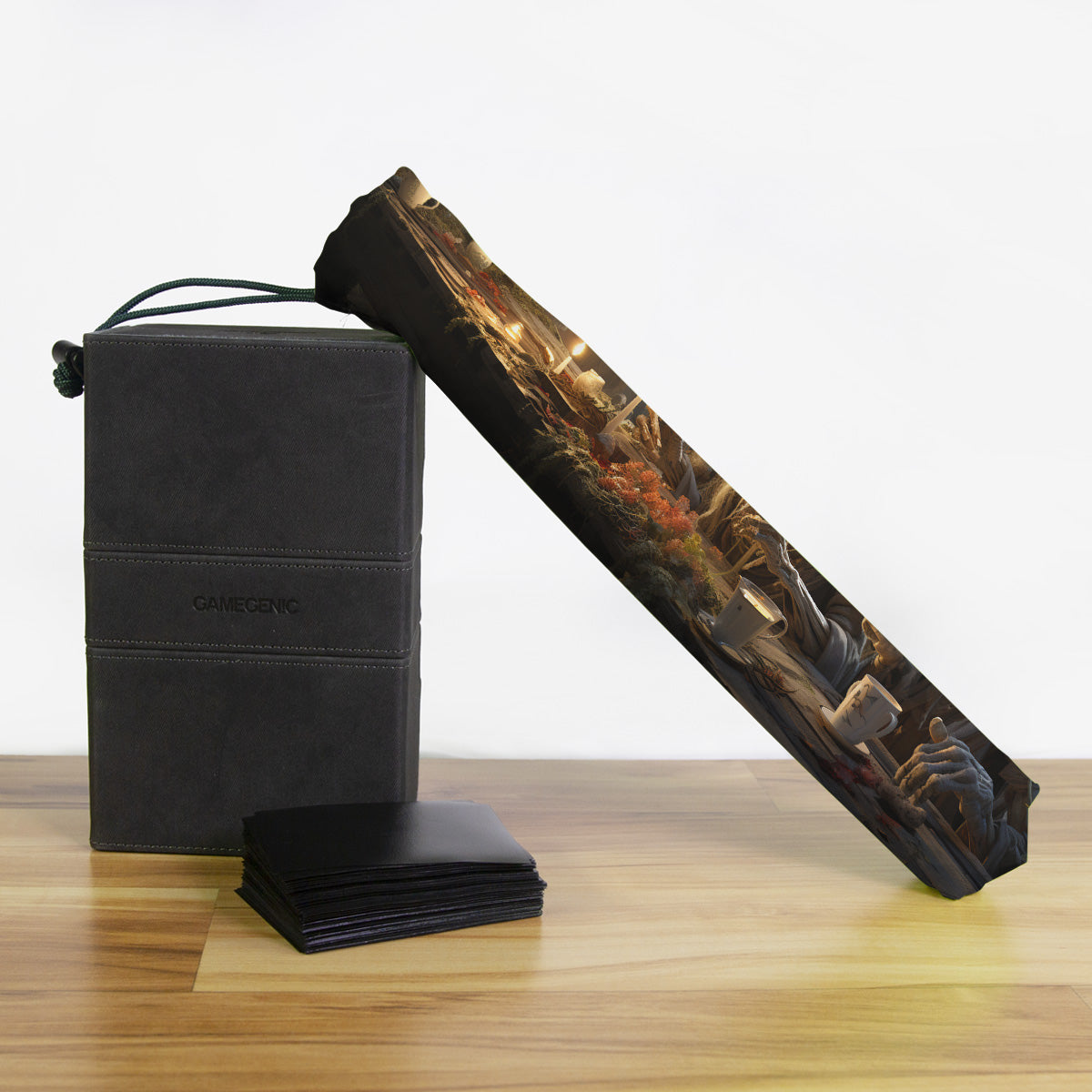 Keep your playmat in pristine condition wherever you go with one of our handcrafted playmat bags. This playmat bag is specifically designed to protect your playmat and can hold two standard sized mats at the same time (in case you need a backup or your friend forgets theirs). Each bag is made in-house and features a water-resistant coating along with a drawstring and carabiner clip for secure carrying. So you can take your game anywhere and in any weather.