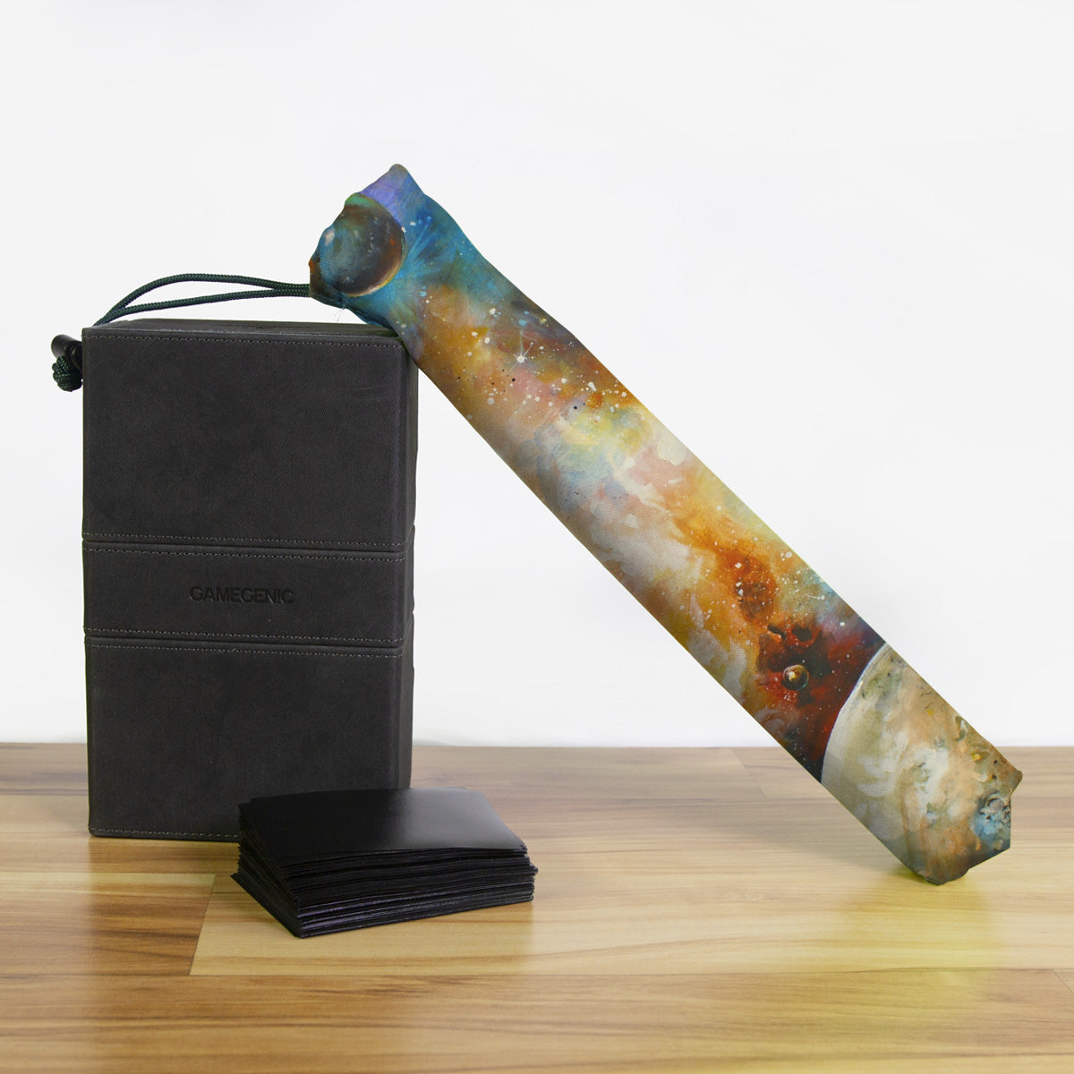 Keep your playmat in pristine condition wherever you go with one of our handcrafted playmat bags. This playmat bag is specifically designed to protect your playmat and can hold two standard sized mats at the same time (in case you need a backup or your friend forgets theirs). Each bag is made in-house and features a water-resistant coating along with a drawstring and carabiner clip for secure carrying. So you can take your game anywhere and in any weather.