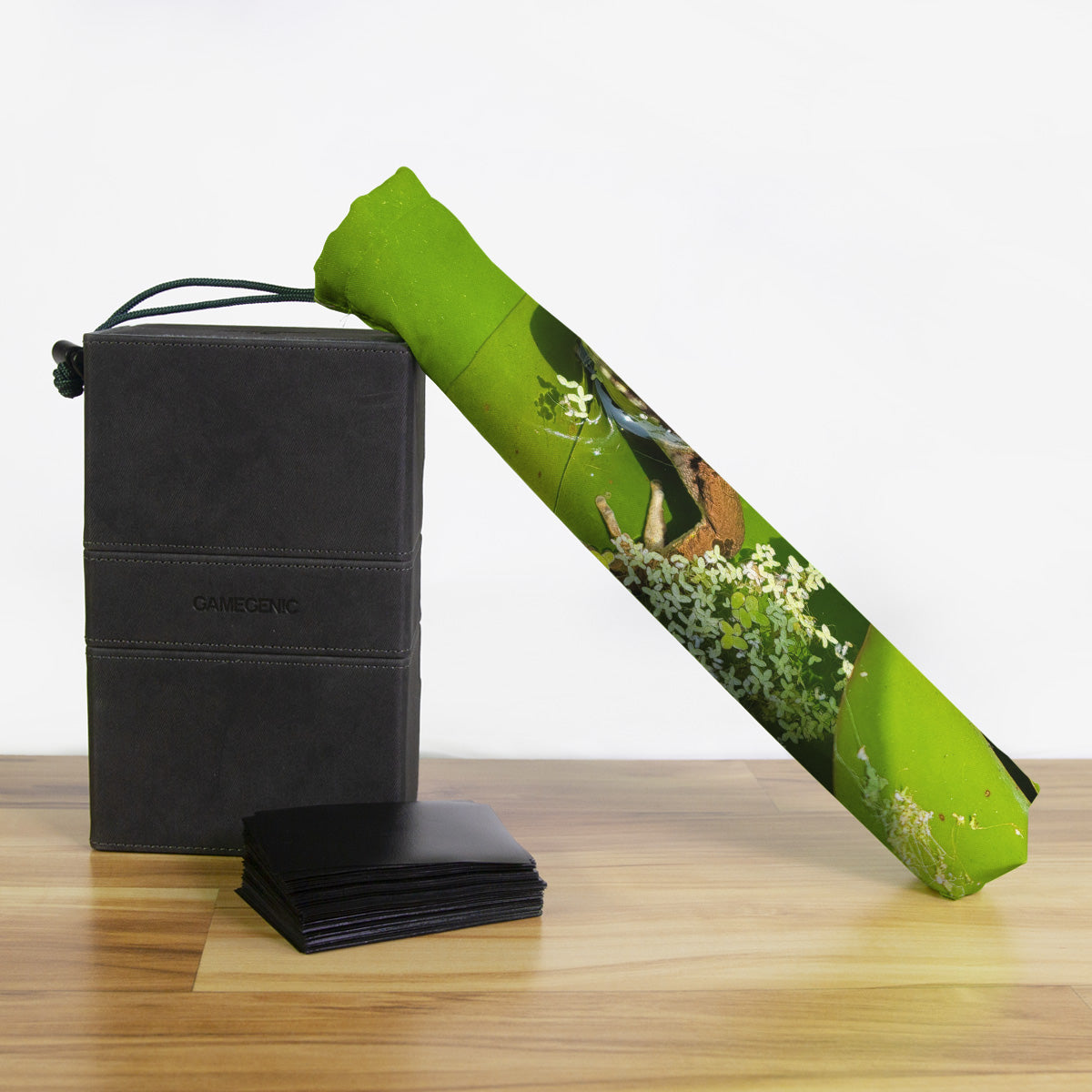 Keep your playmat in pristine condition wherever you go with one of our handcrafted playmat bags. This playmat bag is specifically designed to protect your playmat and can hold two standard sized mats at the same time (in case you need a backup or your friend forgets theirs). Each bag is made in-house and features a water-resistant coating along with a drawstring and carabiner clip for secure carrying. So you can take your game anywhere and in any weather.