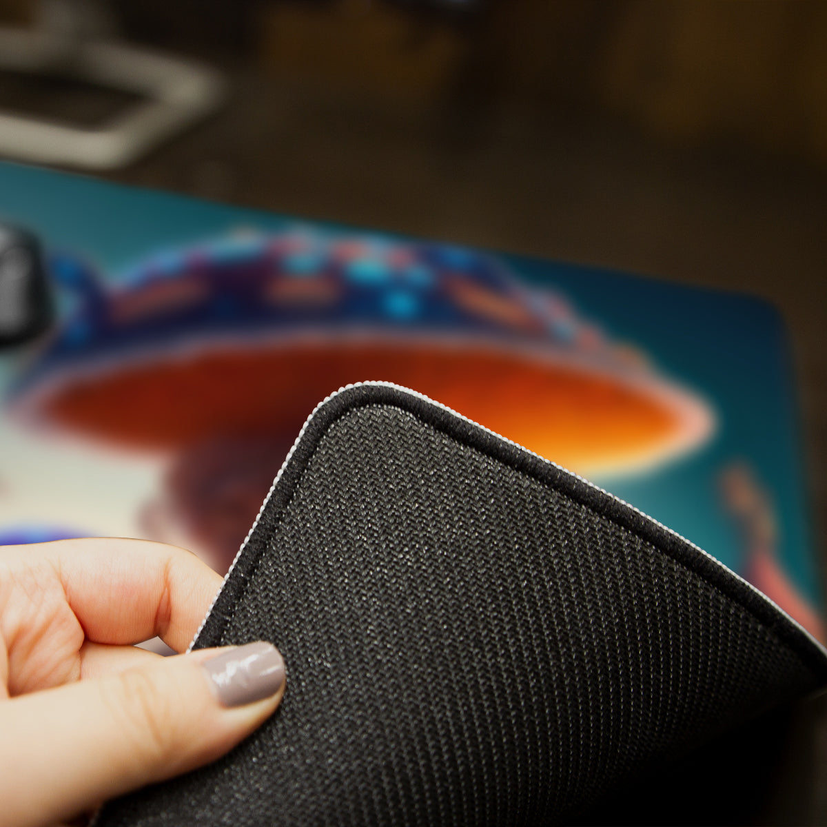 Need a new mousepad that features quality craftsmanship and creativity? Then you’ve definitely come to the right place. Our mousepads are made in-house with premium materials and unique artwork that give your battlestation the supreme look and feel that it deserves. The top is made from sleek polyester, which enables faster, more precise mouse movements. This enhanced speed and precision come in handy whether you’re working or gaming. On the bottom, there’s a strong anti-slip rubber backing that holds a nice, tight grip on your desk while you’re doing your thing. The action and traction this pad provides give you a better overall experience in completing daily tasks, deadlines, and missions of all kinds. And because we’ve added more sizing options to it, you no longer have to worry about running out of room at the worst moments either. The sizes are Classic, Large, and XL. The Classic mousepad has unstitched edges. However, the Large mousepad does include stitched edging, while the XL mousepad has both a stitched or unstitched edging option available. You can see the approximate measurements of all those sizes in the details below. We think you’ll be impressed…if you aren’t already!