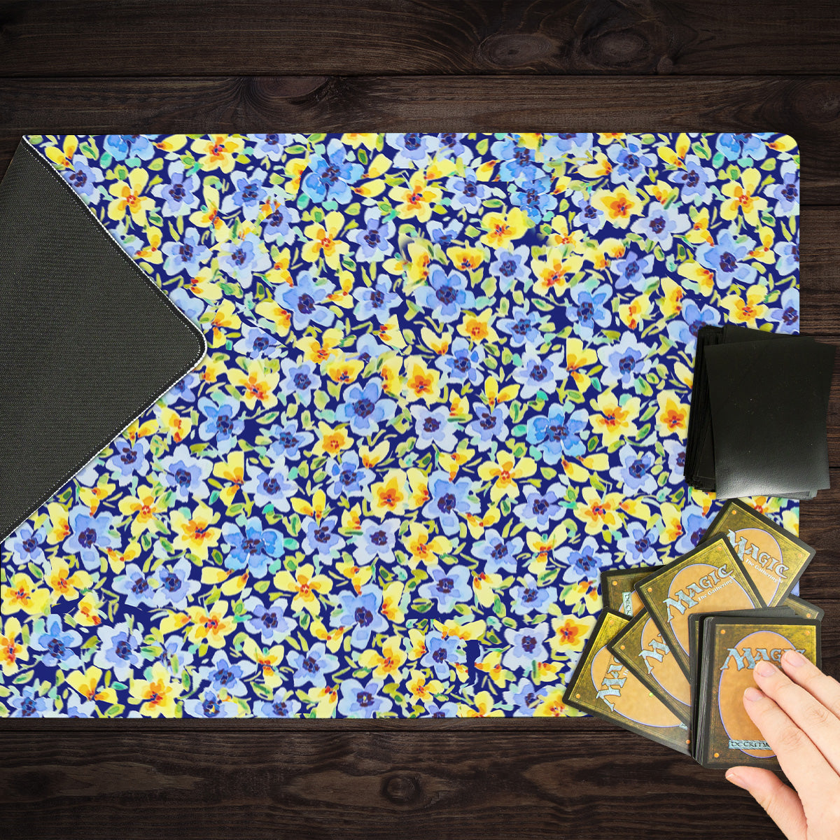 Standard Playmat measures at 24” x 14” inches and is 1/16 of an inch thick. It’s made with a smooth cloth top and strong rubber backing.