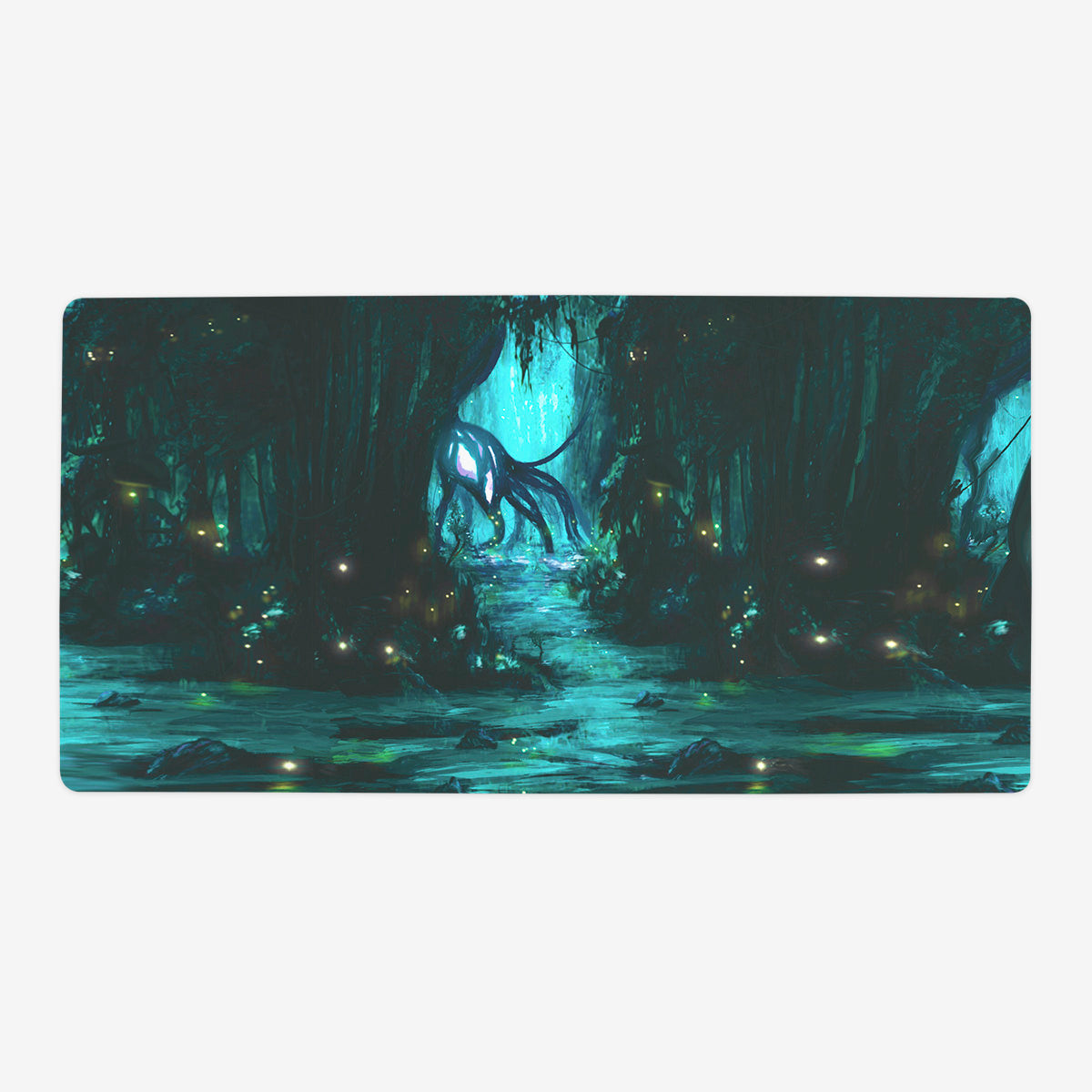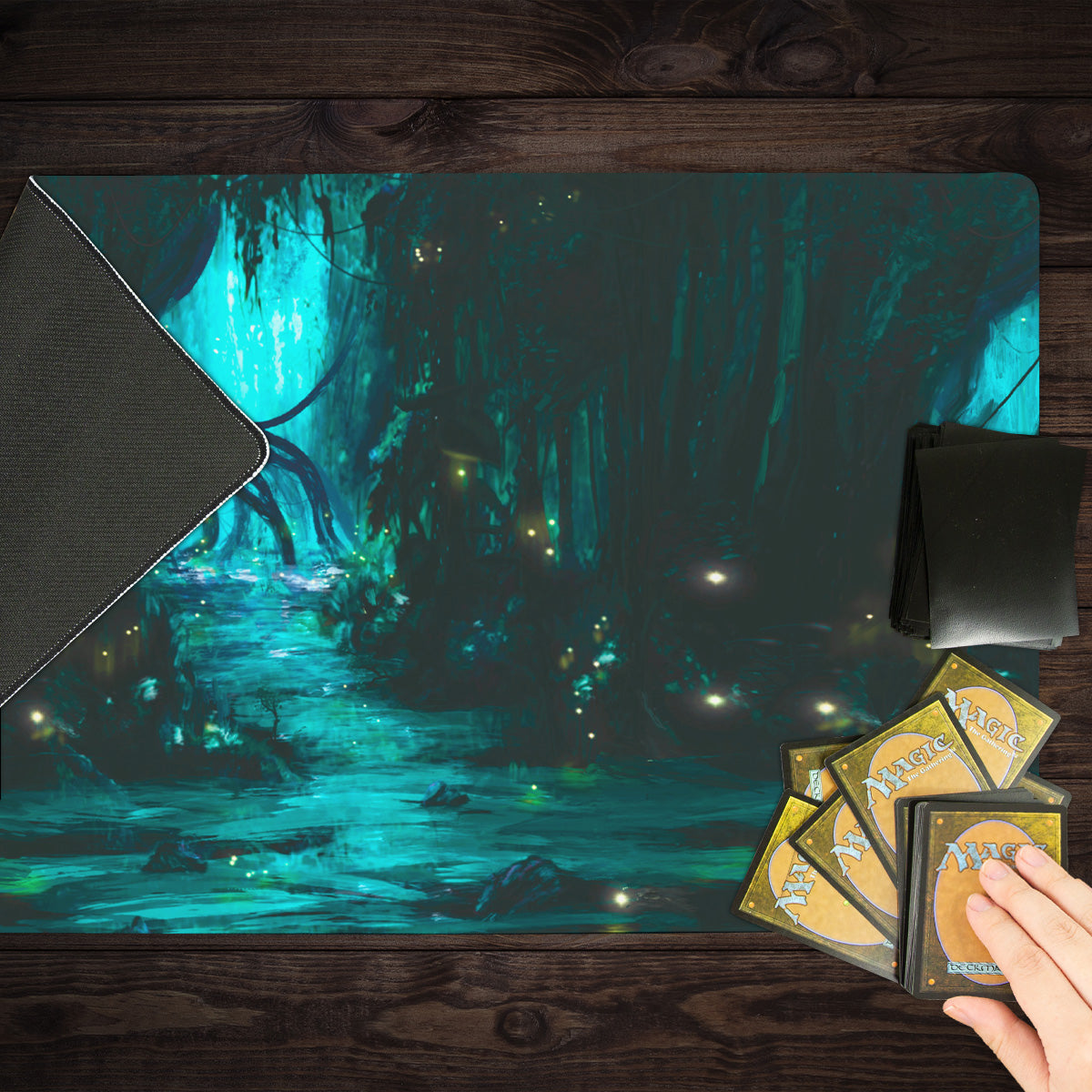 Oversized Playmat measures at 28” x 14” inches and is 1/16 of an inch thick. It’s made with a smooth cloth top and strong rubber backing.