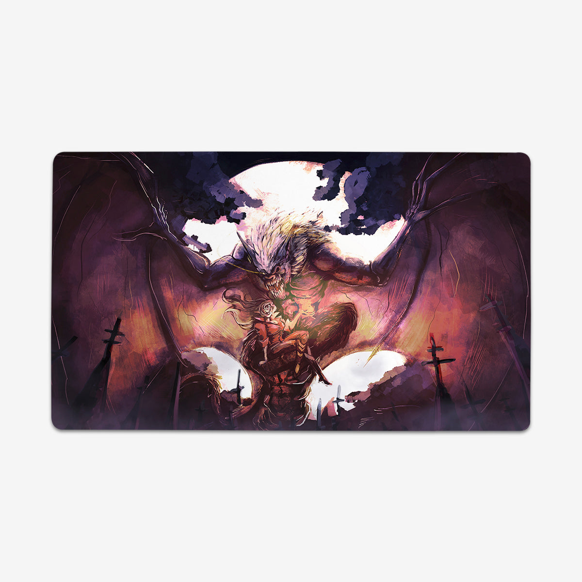 Oversized Playmat measures at 28” x 14” inches and is 1/16 of an inch thick. It’s made with a smooth cloth top and strong rubber backing.
