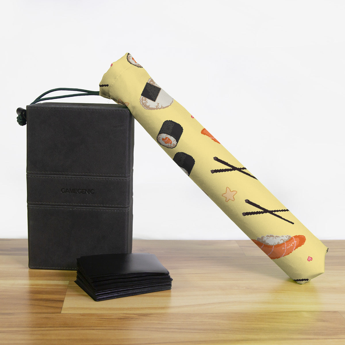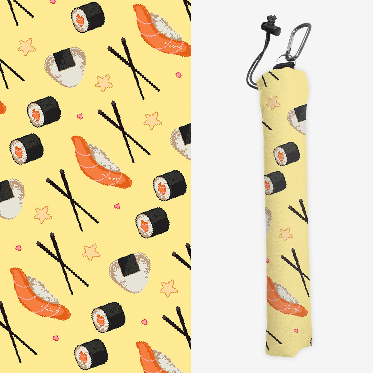 Playmat Bags are specifically designed to hold your mats in style. They are large enough to carry up to two mats. They are coated to be water resistant and include a strap with carabiner for carrying on your backpack. Our bags are hand made in house, and to order. A design that is vertical or patterned would be best for this type of product.