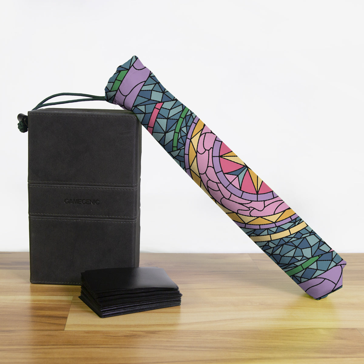 Carry your game with elegance and class with this beautifully designed piece of stained glass! All playmat bags are specially handcrafted in-house and come with a few handy features to keep your mat(s) preserved wherever the game is going down. These handy features include a strong carabiner clip, a drawstring and water-resistant coating. So, this bag ensures that your playmat(s) are secured, preserved and dry, no matter what. We’ve even made it roomy enough for you to carry up to two (2) standard size playmats at the same time, which is great if you love always having a backup!