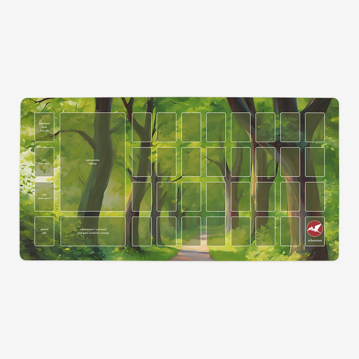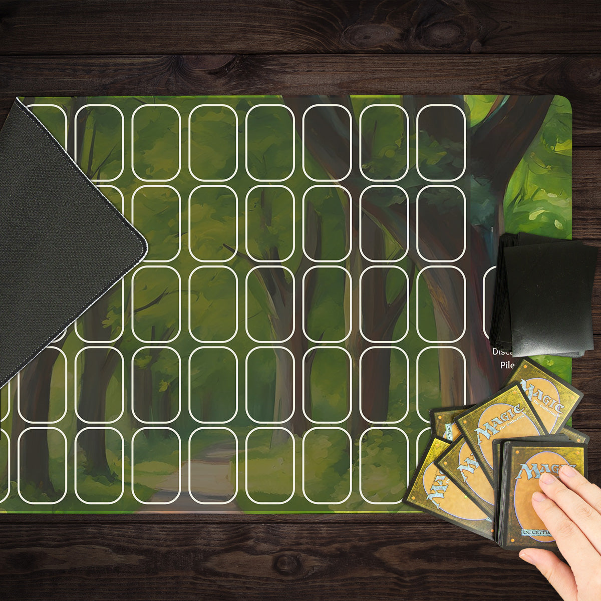 Oversized Playmat measures at 28” x 14” inches and is 1/16 of an inch thick. It’s made with a smooth cloth top and strong rubber backing.