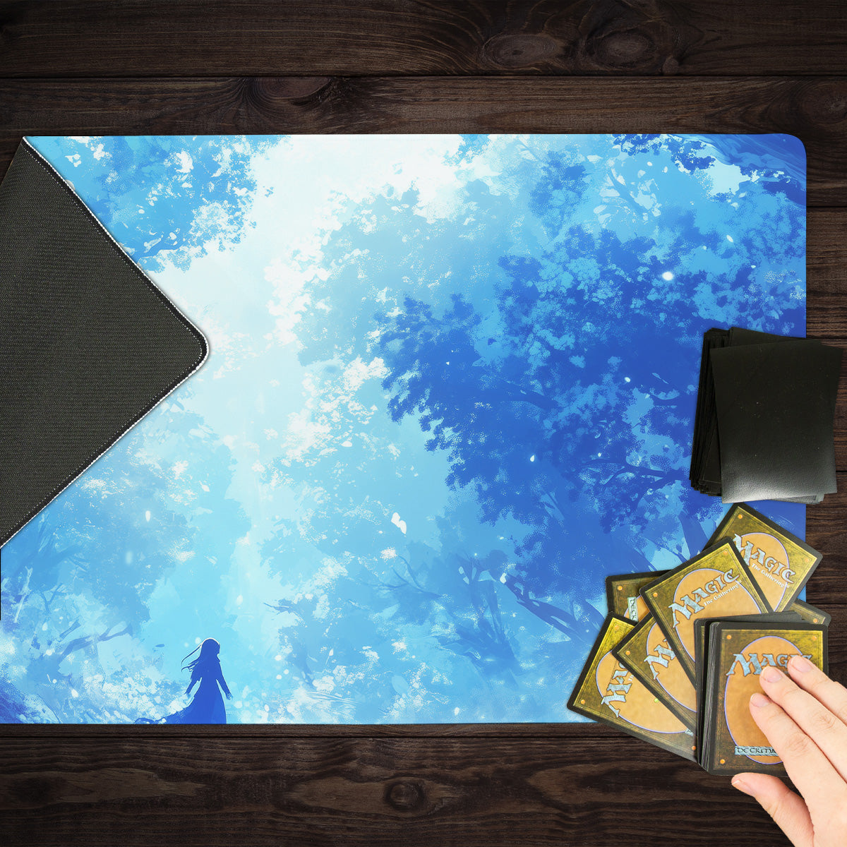 Standard Playmat measures at 24” x 14” inches and is 1/16 of an inch thick. It’s made with a smooth cloth top and strong rubber backing.