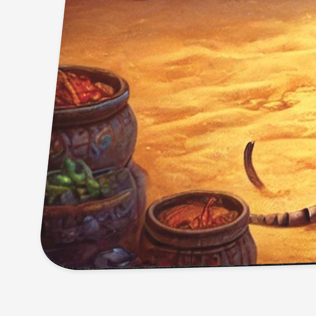 Standard Playmat measures at 24” x 14” inches and is 1/16 of an inch thick. It’s made with a smooth cloth top and strong rubber backing.