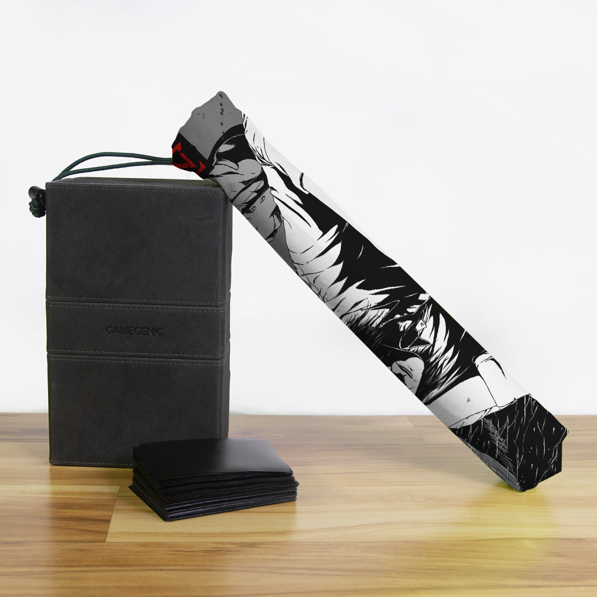Playmat Bags are specifically designed to hold your mats in style. They are large enough to carry up to two mats. They are coated to be water resistant and include a strap with carabiner for carrying on your backpack. Our bags are hand made in house, and to order. A design that is vertical or patterned would be best for this type of product.