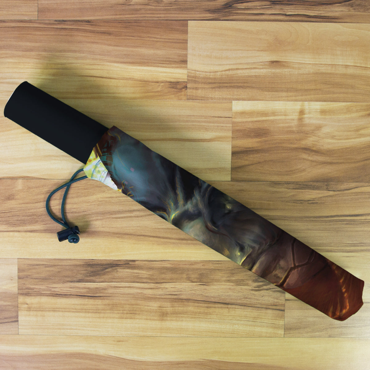 Playmat Bags are specifically designed to hold your mats in style. They are large enough to carry up to two mats. They are coated to be water resistant and include a strap with carabiner for carrying on your backpack. Our bags are hand made in house, and to order. A design that is vertical or patterned would be best for this type of product.