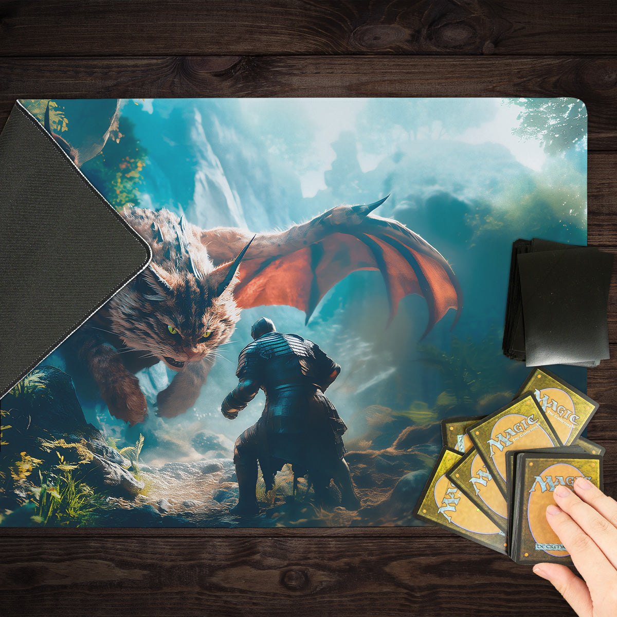 Oversized Playmat measures at 28” x 14” inches and is 1/16 of an inch thick. It’s made with a smooth cloth top and strong rubber backing.