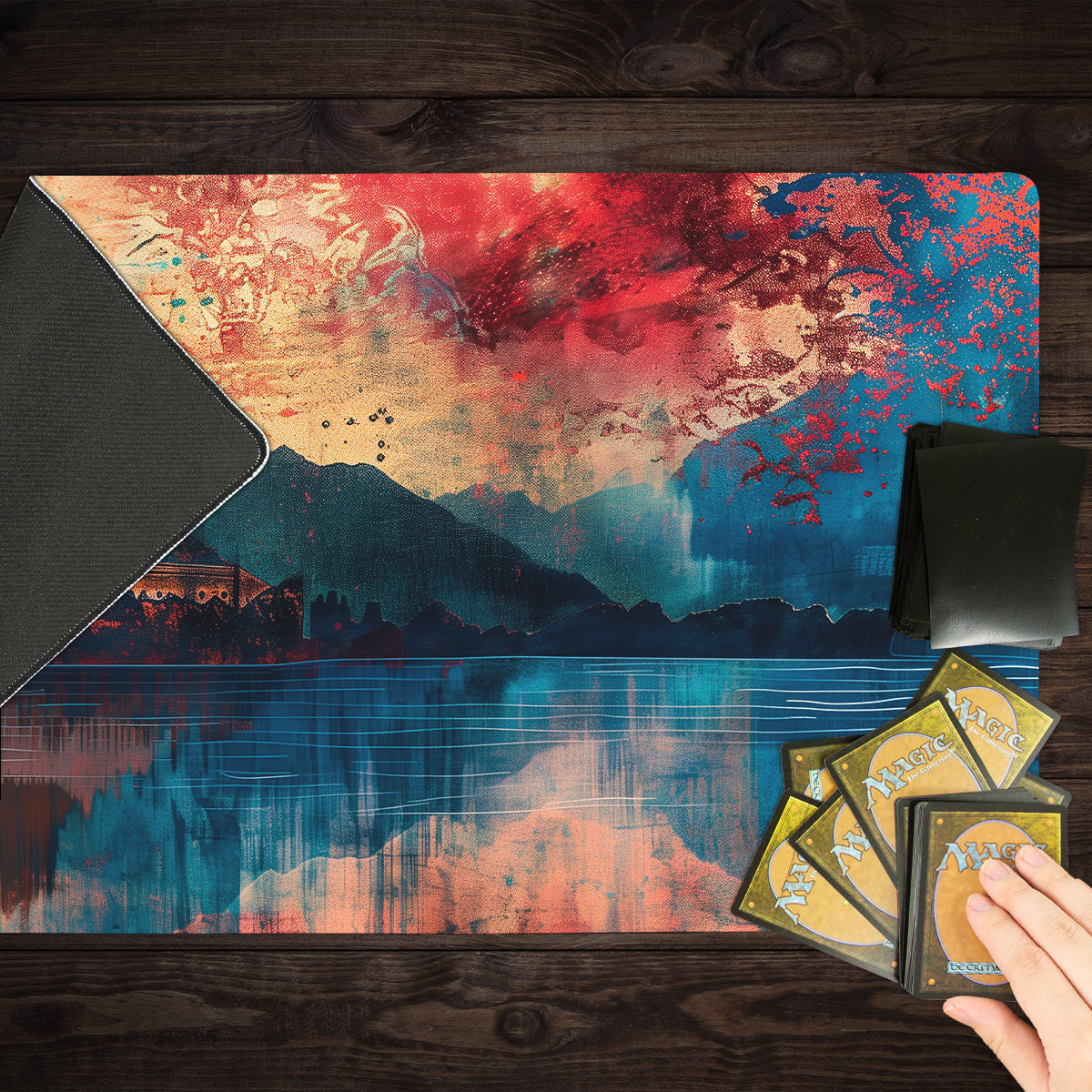 Oversized Playmat measures at 28” x 14” inches and is 1/16 of an inch thick. It’s made with a smooth cloth top and strong rubber backing.