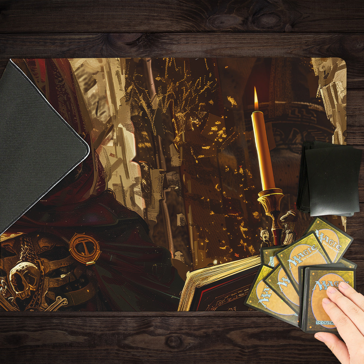 Oversized Playmat measures at 28” x 14” inches and is 1/16 of an inch thick. It’s made with a smooth cloth top and strong rubber backing.
