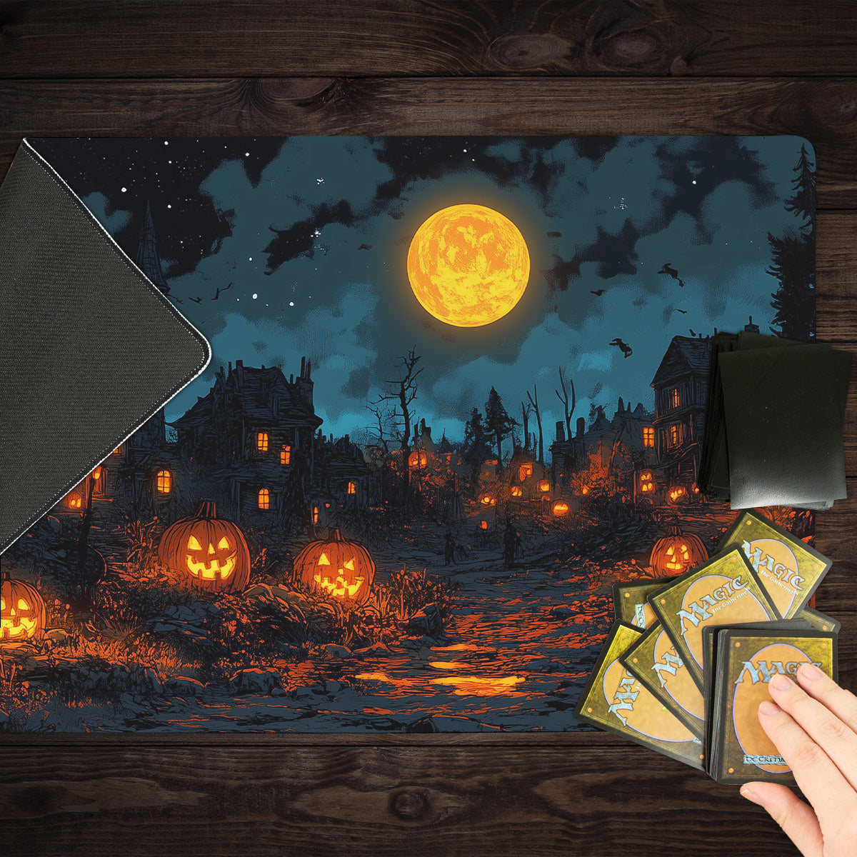 Oversized Playmat measures at 28” x 14” inches and is 1/16 of an inch thick. It’s made with a smooth cloth top and strong rubber backing.