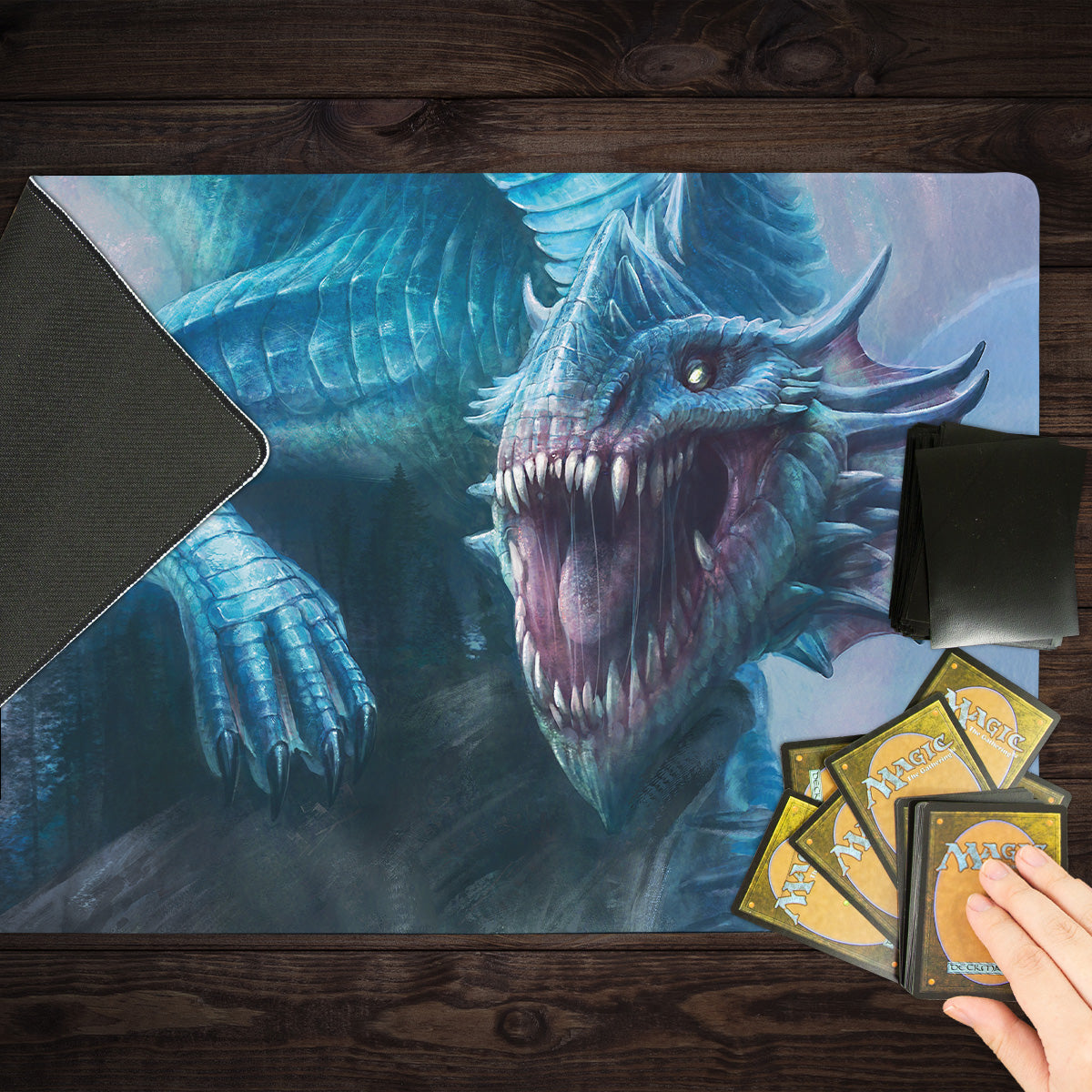 Oversized Playmat measures at 28” x 14” inches and is 1/16 of an inch thick. It’s made with a smooth cloth top and strong rubber backing.